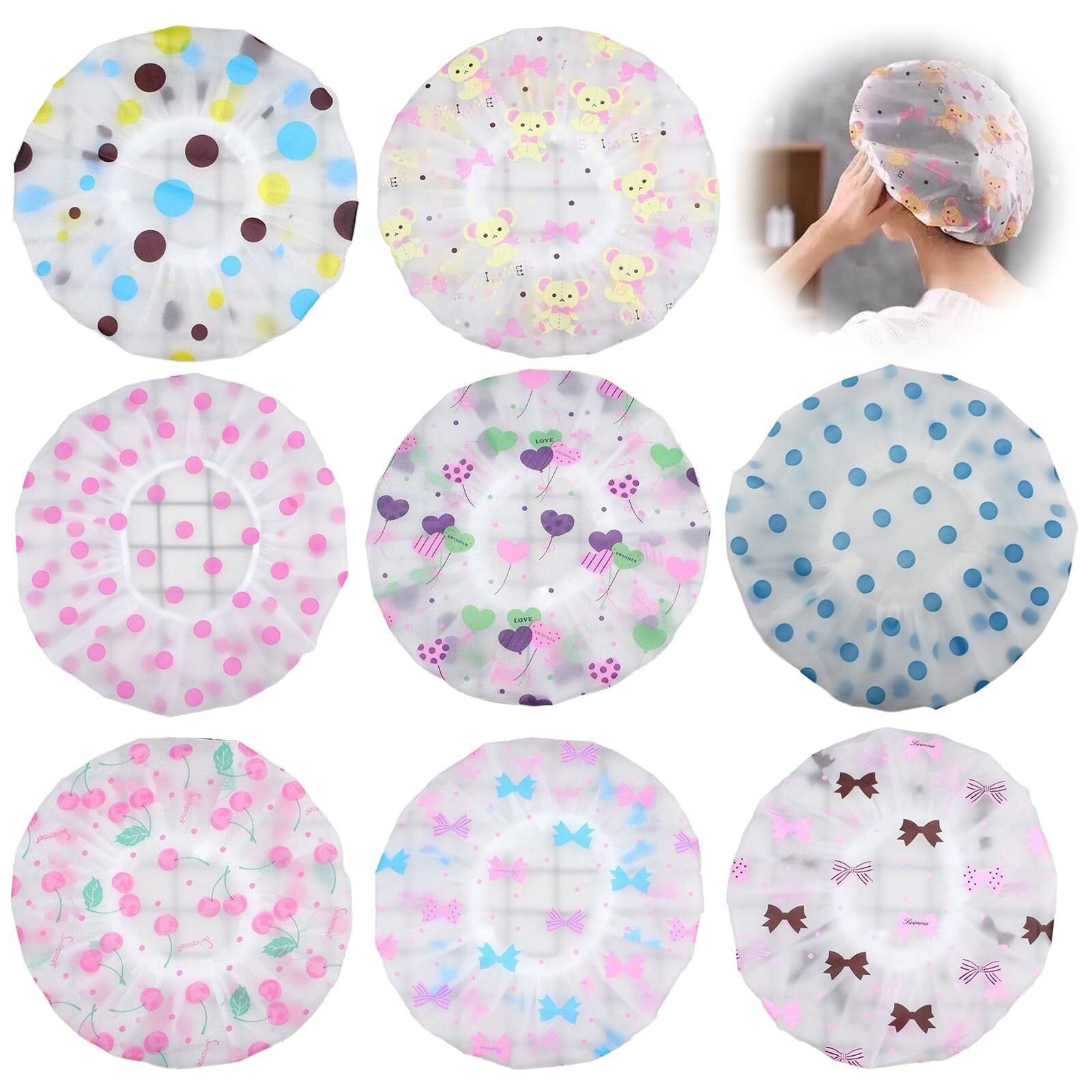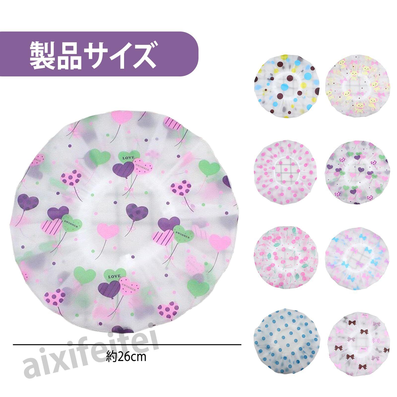 【商品規格】:シャワーキャップは約27.5*27.5cm、重約10g。8点セットで、全て異なるデザイン柄。一つひとつの模様が繊細で可愛らしく、お好みに合わせて自由にお使いいただけます。