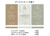 【ダージリンティーの香り】シャンプー12ml、コンディショナー12ml、ボディソープ12ml の3種類を各5点ずつ(計15点)のOPP袋入り。