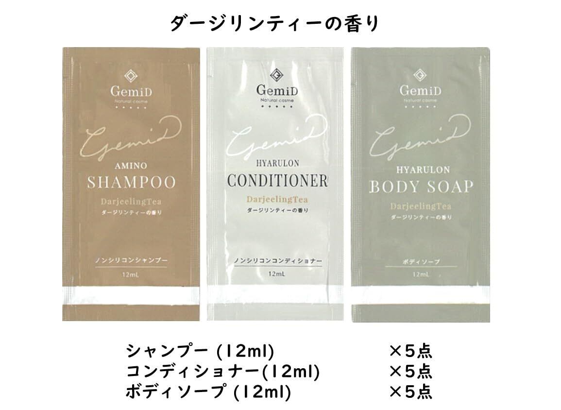 ゼミド シャンプー12ml、コンディショナー12ml、ボディソープ12ml 使い切りパウチ 【ダージリンティーの香り】各5点ずつ(計15点)