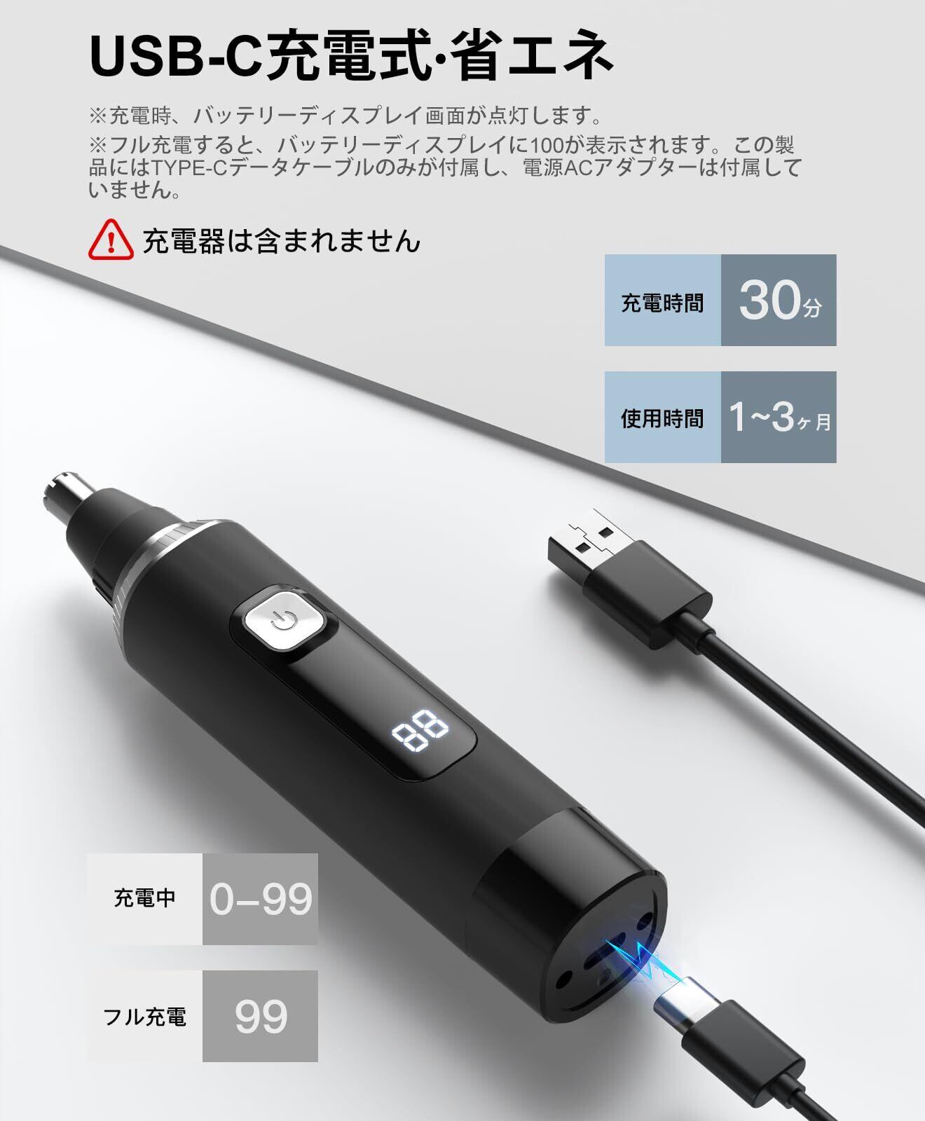 【LCD画面 & Type-C急速充電・驚きの使用時間】デジタルLCDスクリーンを搭載したので、いつでも電力残量を把握することができ、途中で停電する心配がなく、使用体験をアップします。USB充電ポートの独自の設計を使い、過電圧、過充電、短絡を防止し、安全性を向上させる同時に、充電速度を大幅に向上し、満タン充電はわずか2時間です。鼻毛カッター パワフルでありながら消費電力が少なく、1度充電すれば最大3ヶ月間の鼻毛切りが行えるため、出張や旅行の移動用としてバッテリー持ちが良く長時間使えます。