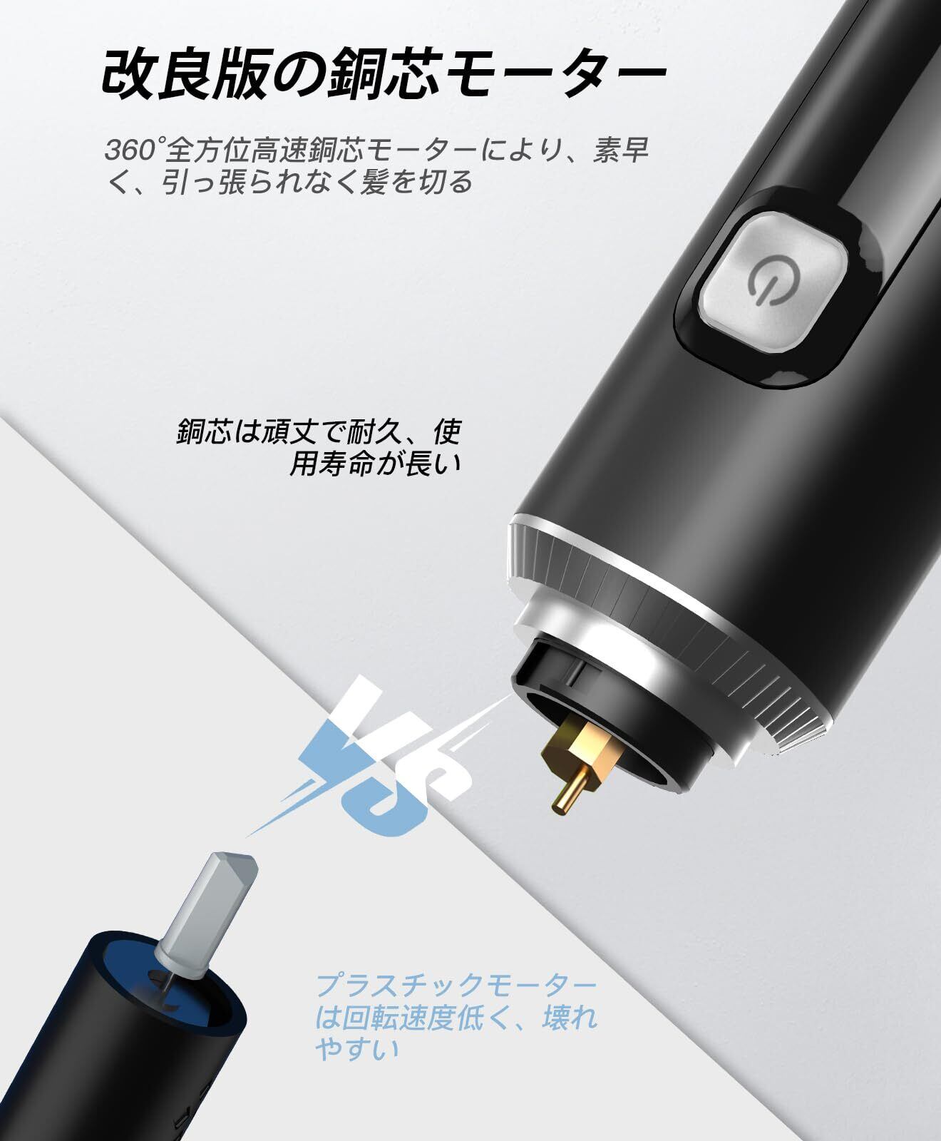 【素敵な外観 / ワンボタンで簡単操作・押すだけで即回転】従来の鼻毛カッターのスイッチは底面に設置されており、使用には不便なものが多いです。の多機能鼻毛カッターは業界最新デザインとしてのスイッチが本体の中央に搭載されています。ボタンを押すだけで電源オンになり、片手でも把握で きるシンプル操作だから初めての方でも簡単に使いこなせます。【上品なアルミ合金製・極上の触り心地】鼻毛カッター 充電式の本体は高級感のあるアルミニウム合金素材に改良し、優れた放熱性を持つ、質感もアップしました。さらに鼻毛カッター メンズのカッターヘッドが高品質な断熱材を採用し、長時間使用しても発熱しにくく、安全安心かつ快適なカット体験が可能。