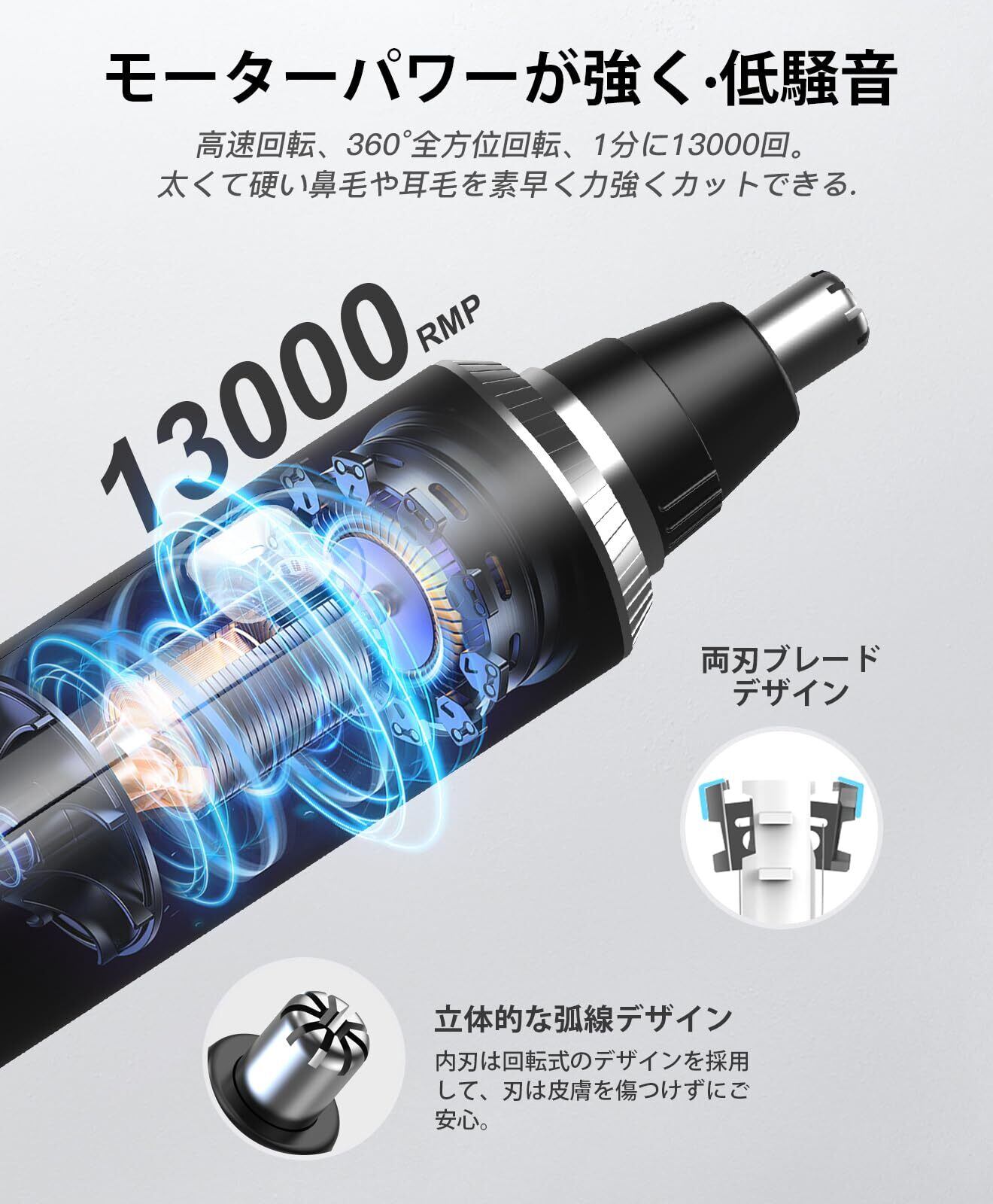 【高速静音モーター・360°両回転両刃】鼻毛カッターは全銅DC、トップレベルの高トルクブラシレスマイクロモーターを採用し、カーボンブラシの摩擦音を効果的に低減し、損失を大幅に減す同時に耐用年数を改善し、更に13,000 rpmでスムーズに動作することもできます。精密な360°両回転両刃ステンレス刃を搭載し、太くて硬い鼻毛や耳毛も楽にカットできます。刃は人間工学に基づいた 3D デザインを使い、保護キャップ付き、刃の円形形が 360 度のスリットから入る鼻毛を捉えます。電動鼻毛カッター鼻腔にしっかりとフィットし、鼻毛を引っ張らなく、鼻の内部を傷つけなく、更に抗アレルギー、もっと安全で快適に使用できます。鼻毛カッター メンズコンパクトデザインにもかかわらず、強力なカットを確保しながら回転音を最小限に抑えます。低騒音設計なので、静かな環境で使用しても、他人に迷惑をかけることはありません。