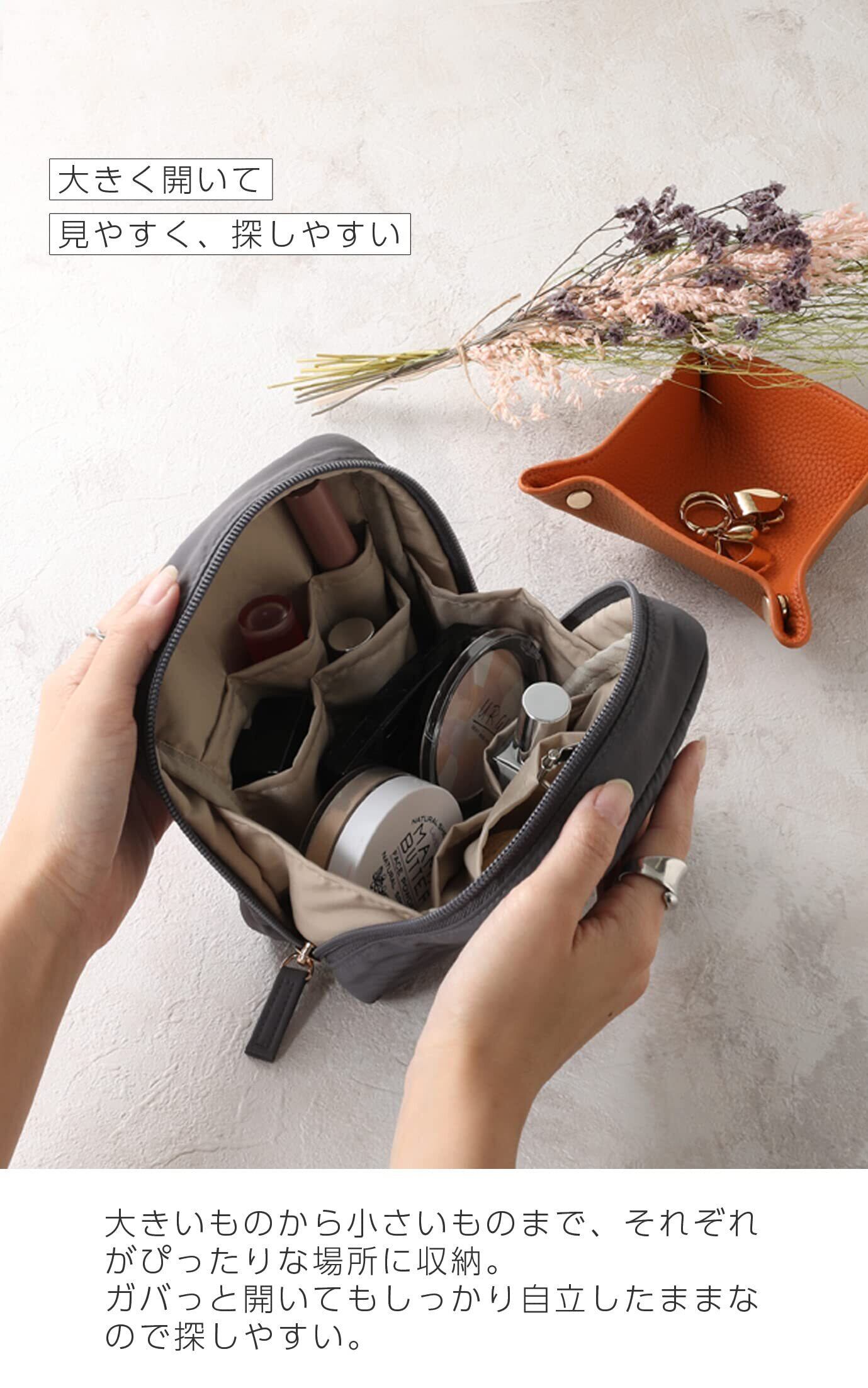 【大容量で楽々収納】使いたいものをサッと取り出せるので、忙しい朝に大活躍。家の中でも外出の時も、このポーチがあればスッキリまとまります。パウダー、下地、ビューラー、ハイライトなどの大きめのコスメから、マスカラやリップやブラシという縦長のコスメも常に持ち歩く日焼け止めやファンデーションもしっかり収納可能です。