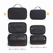 【収納】2段階で大容量:1階:ファスナーポケット1個、メッシュポケット1個、高さ1.5cm 2階:ストレッチネット、空きフロア、5cm高さの小さなサイズ、7cm高さの大きなサイズ。ジッパーは使いやすい ダブルジッパー付き。旅行時や出張時などに充電ケーブルやアダプタ、マウスなどをまとめて収納できる小物収納ポーチです。