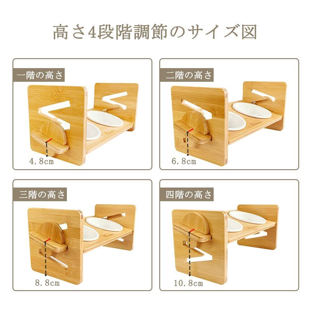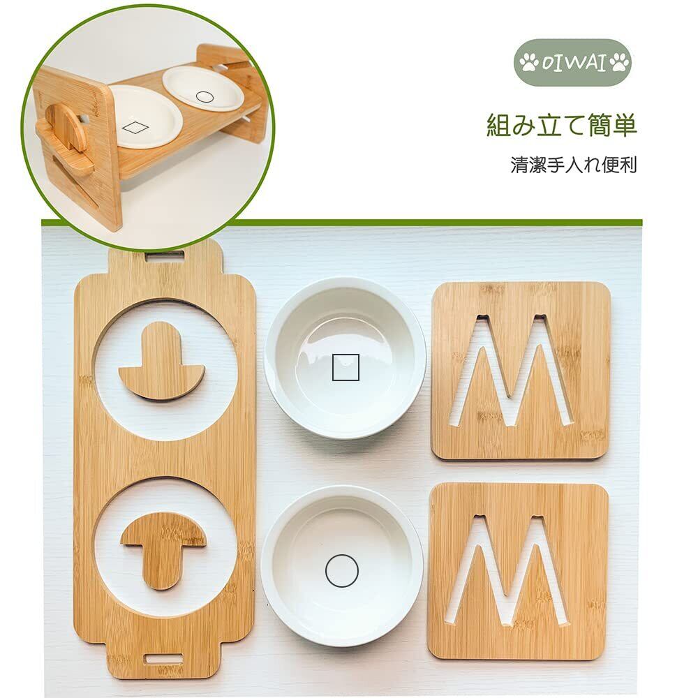 「セット内容&サイズ」:セット内容:陶器フードボウル*2、竹製フードボウルスタンド*1。サイズ」:セラミック( 陶器)フードボウル、竹製スタンド。 フードボウル内径9.8cm 、容量190ml。竹製スタンド幅36cm 、奥行14.2cm 。餌台面 の高さは4.8cm-10.8cm調整可能。