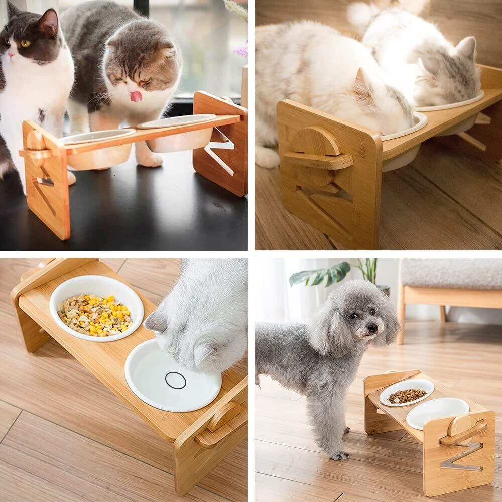 猫 犬用 食器 ペット食器台 エサ台 小型犬食器 餌台 餌入れ えさ皿 ペット食器 スタンド付き フードボウル 水ボウル 陶磁器碗 高さ調節可能 (36*14.2cm 斜め餌台面 )