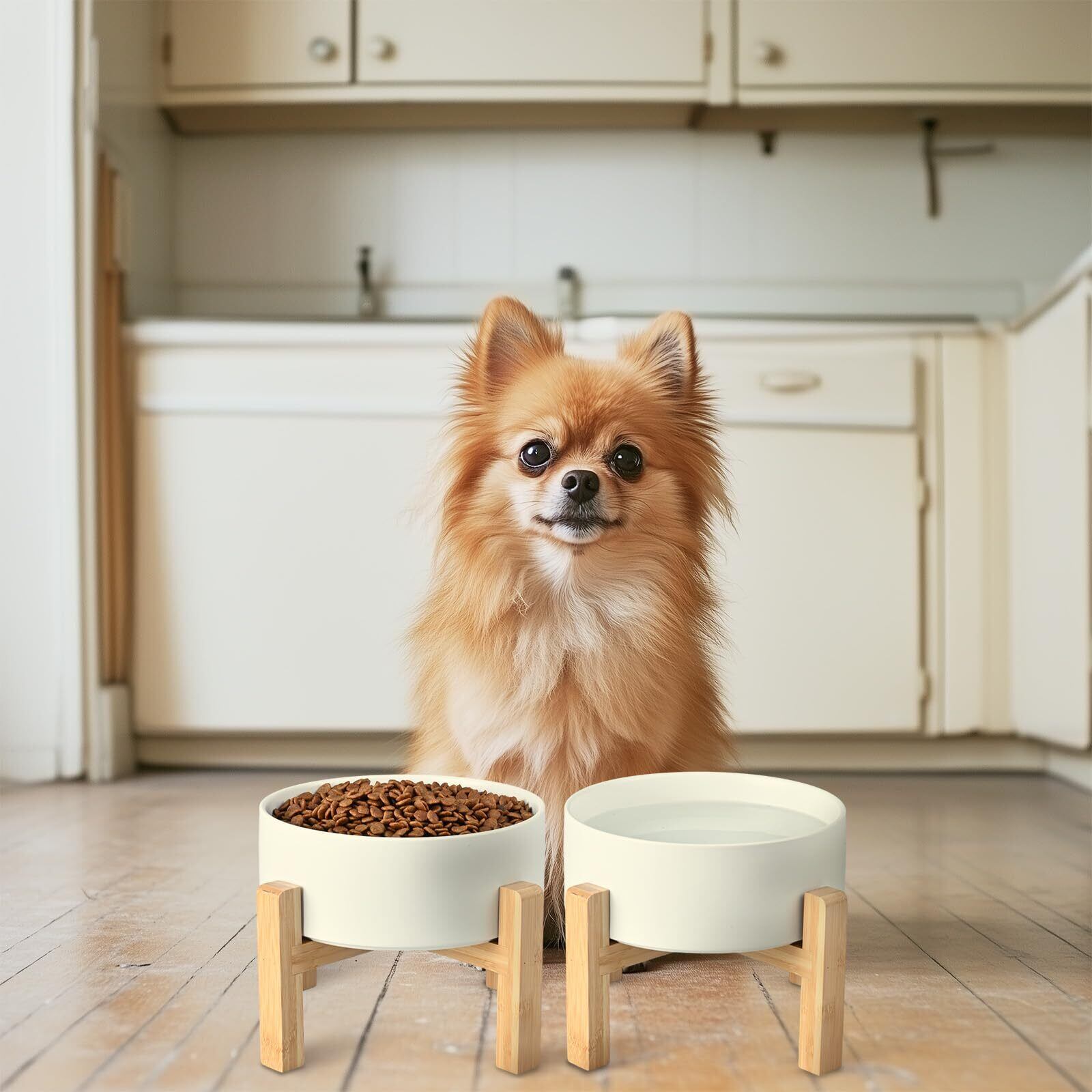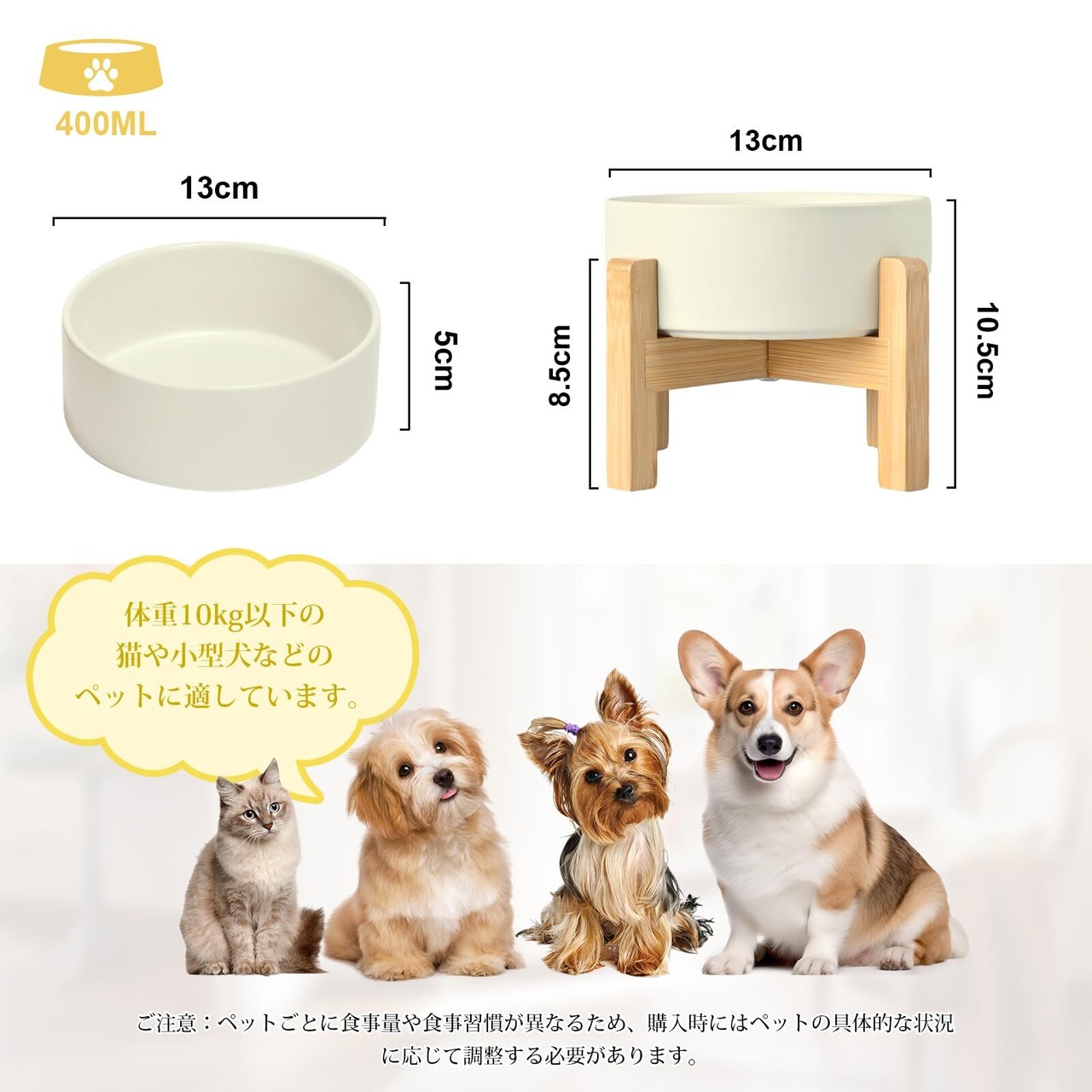 FeedFurry 犬 餌入れ 陶器 ボウル 猫 ペット えさ 皿 水入れ 木製ボウルスタンド フードボウル 小型犬 2個 400ml ベージュ
