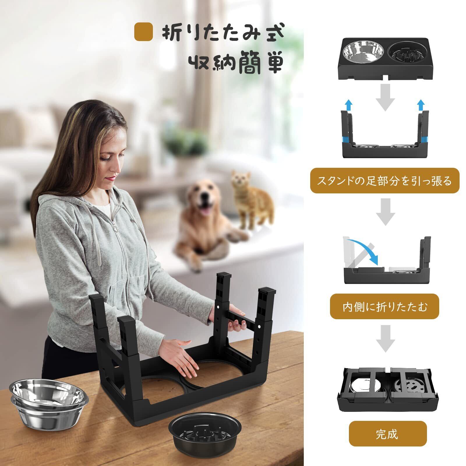 「広い適用性」 ステンレスボウルは取り外して使用でき、在宅の利用はもちろん、愛犬と散歩やトレーニング時、又は外出、旅行先で簡単にペットのお食事を用意できます。スタンドを含めて最小42.5*24*8cmの大きさで、スッキリ収納できます。災害時に避難先などにも使え、ひとつ持っておくと安心です。