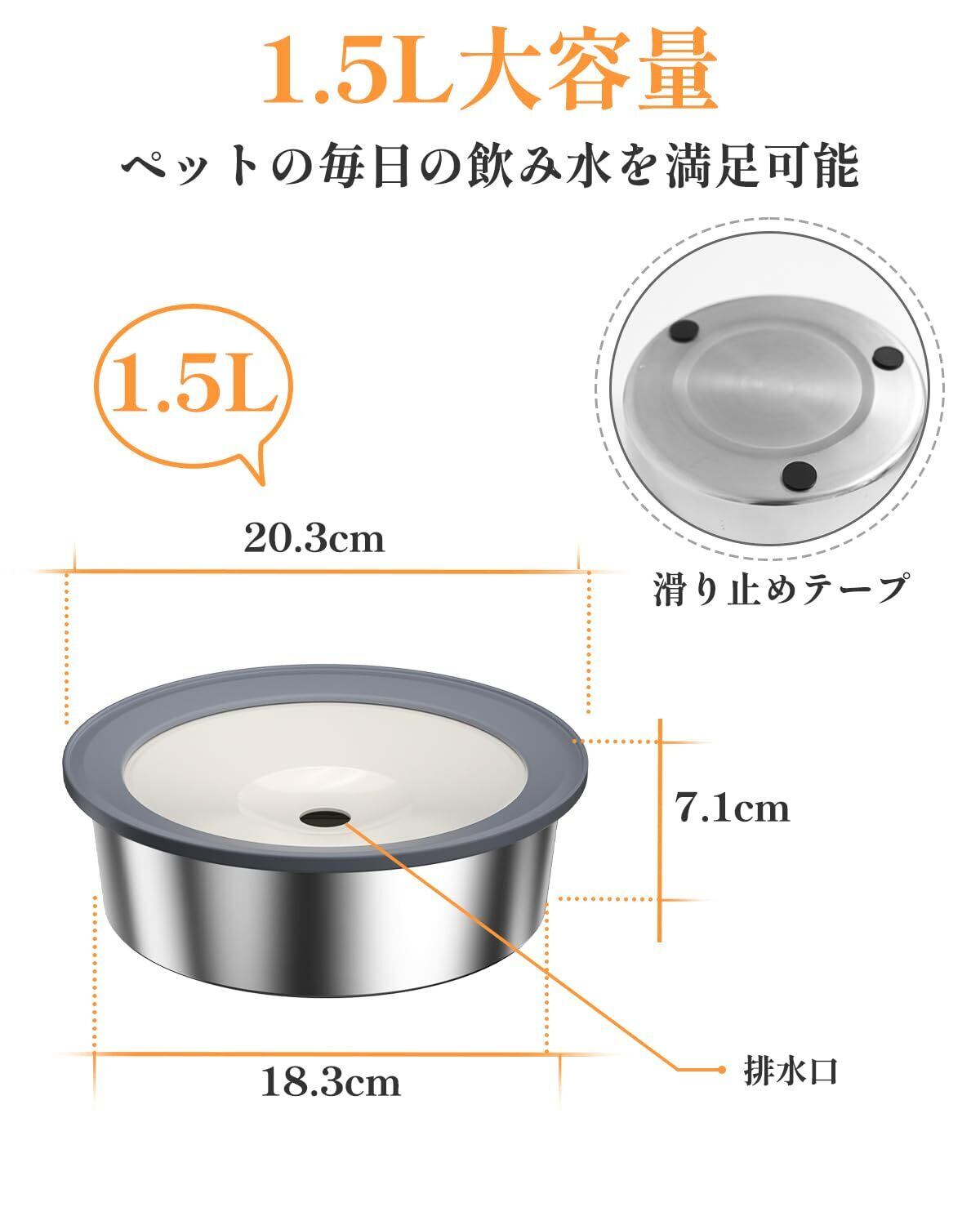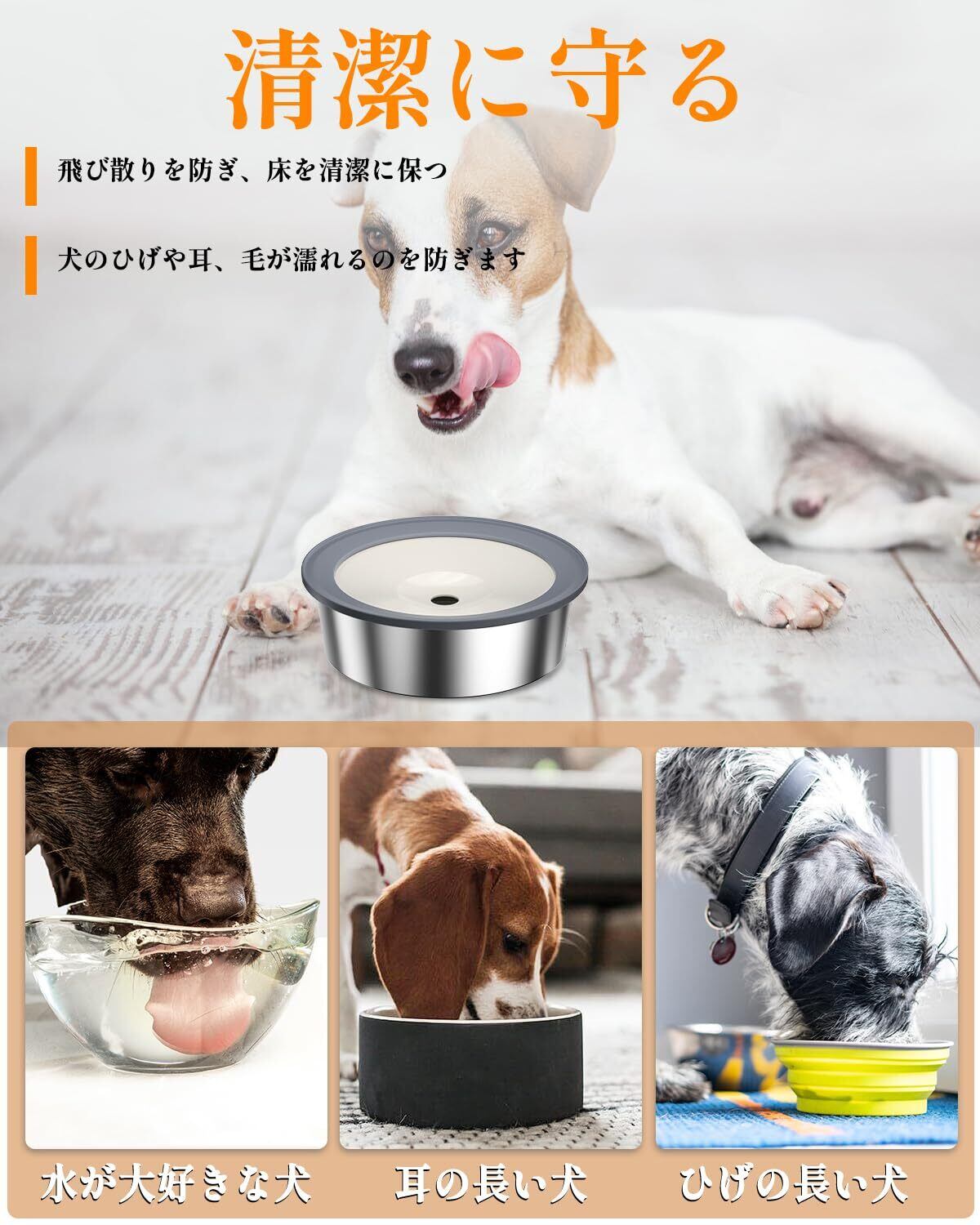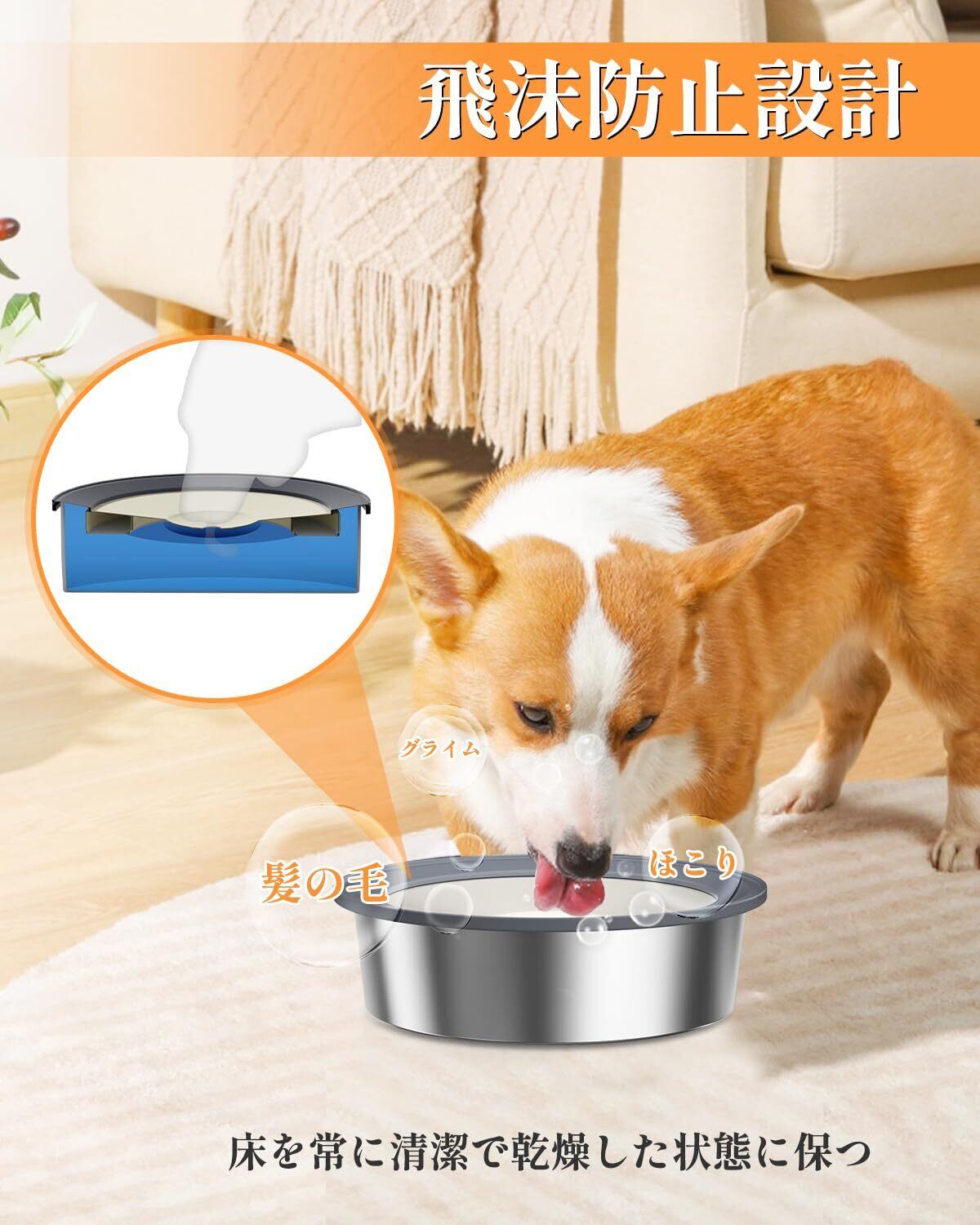 【滑り止めテープ・安定性抜群・騒ぎ音防止】ペットのウォーターボウルの底部に滑り止めテープが付いており、滑らずに安心で使えます。しっかりした設計で、飲水中の安定性をし、水が床に溢れない用、飲み物の衛生をし、床を清潔に保つことができます。飲む時の揺れること、移動する際の騒ぎ音とキズにも有効的に防ぎます