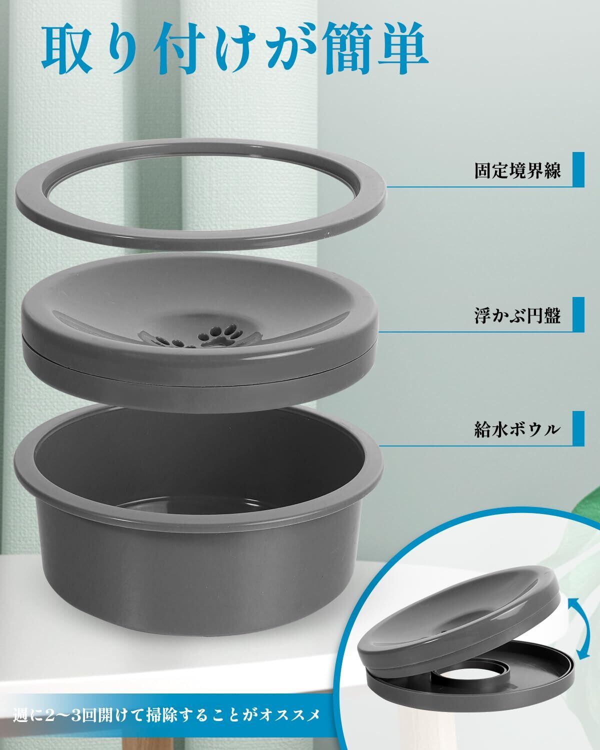 【電源不要 × 分解式構造|持ち運び・手入れ簡単】電気配線不要の簡便設計で、水を注ぐだけですぐに使用可能。外出先や車中でも手軽に設置でき、旅行やドッグランでの活用も便利です。本体と浮き蓋は分解可能で、手洗いはもちろん食器洗い機対応(※洗い網使用推奨)。週 2~3 回の洗浄で細菌繁殖を防ぎ、長期間の衛生的な使用が実現します。
