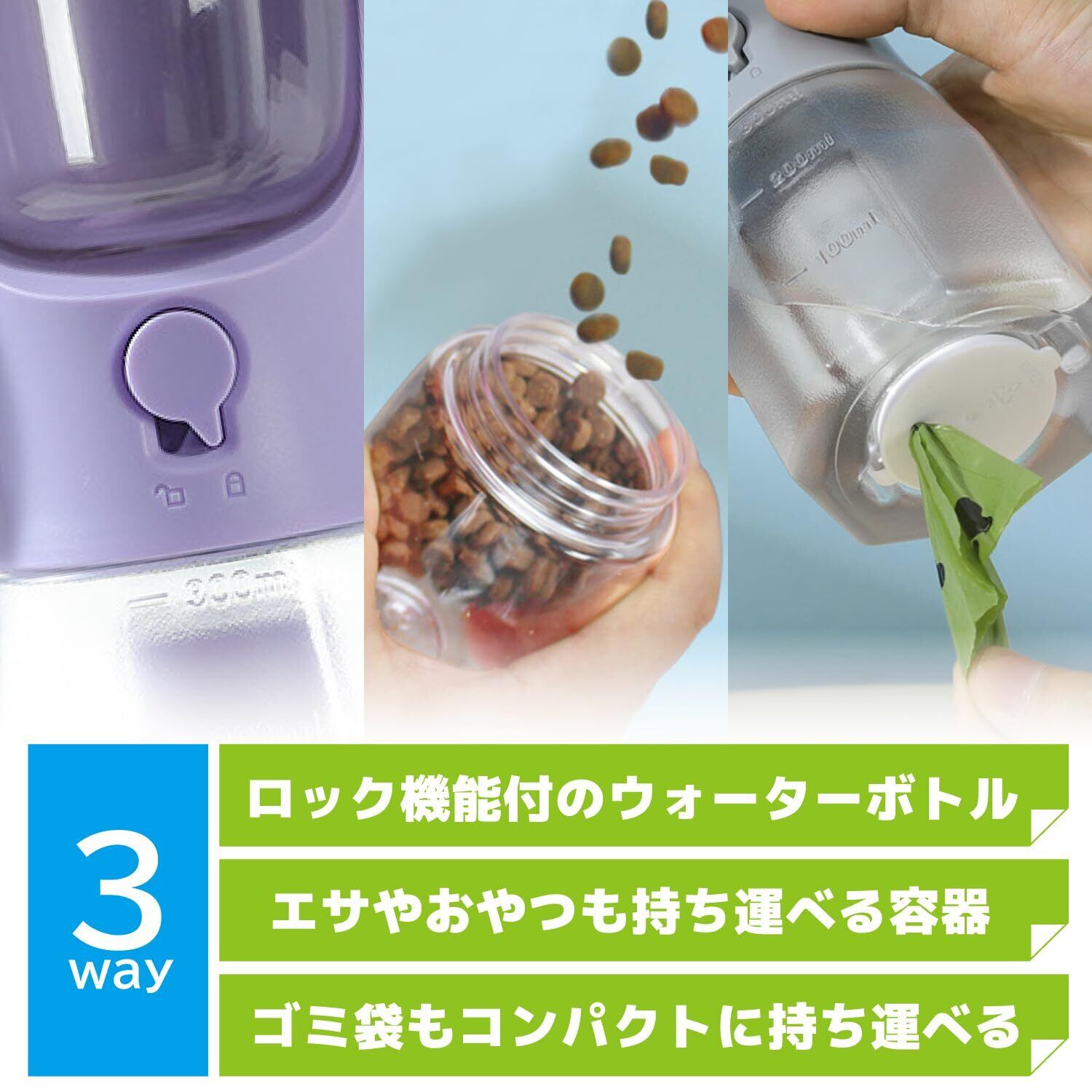 トリーツケース付き、ロール式ゴミ袋収納付き多機能ウォーターボトル 水300ml フード100g(小型犬の約1日分のフードが入るトリーツケース) ボトルには高い透明性と高い耐衝撃性をもつPC素材(ポリカーボネート樹脂)を採用。熱湯消毒が可能なので衛生的にご使用になれます