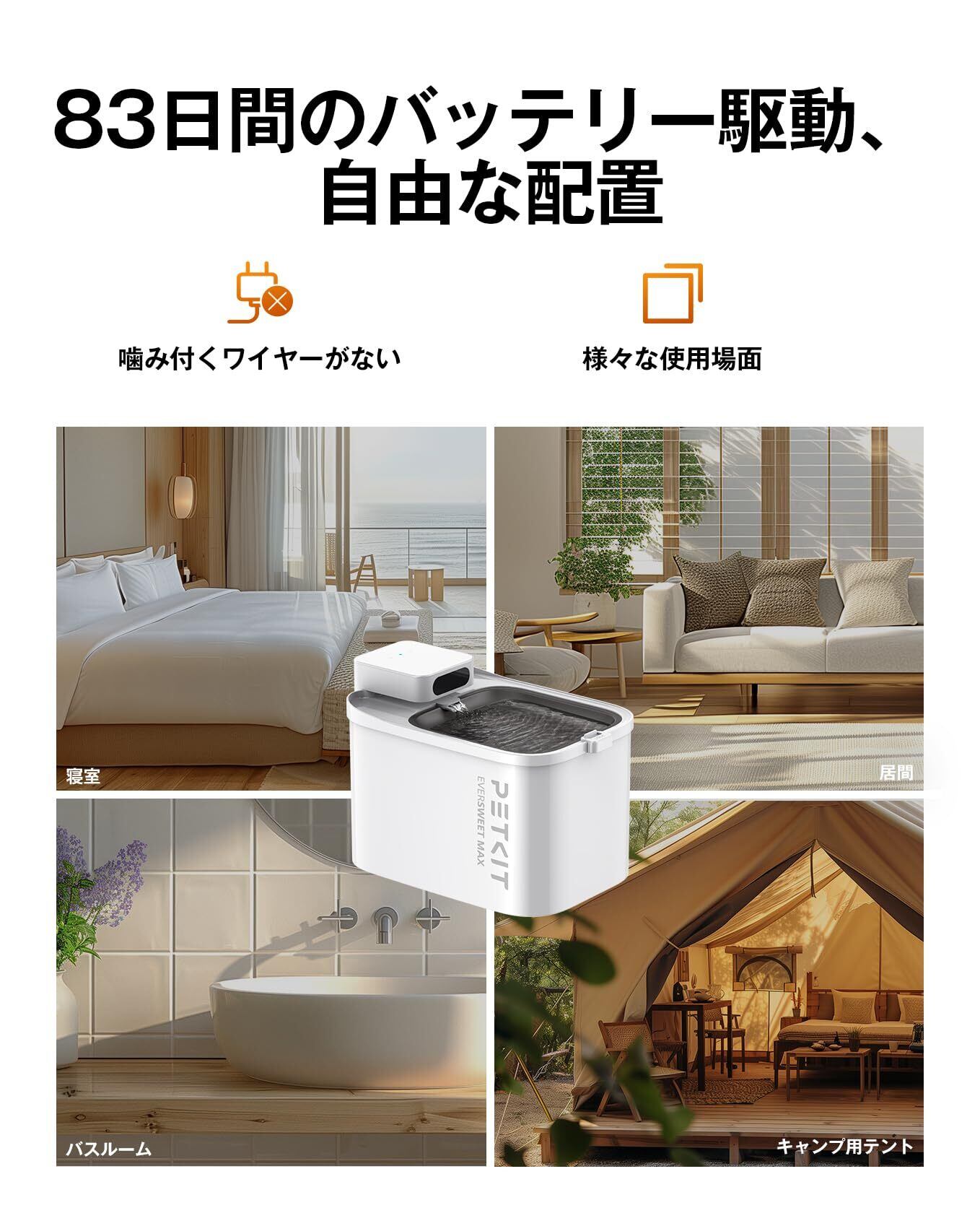 【ワイヤレスペット給水器】PETKITのアップグレードした新型ワイヤレス給水器は、プラグを差し込む必要がなく、台所、寝室、ベランダなどどこにでも置くことができます。5000mAhの大容量バッテリーで、電池寿命は最長83日間!という新感覚の給水器です。停電やミニ旅行の間に猫や犬の水を切らしてしまう心配はもうなし!