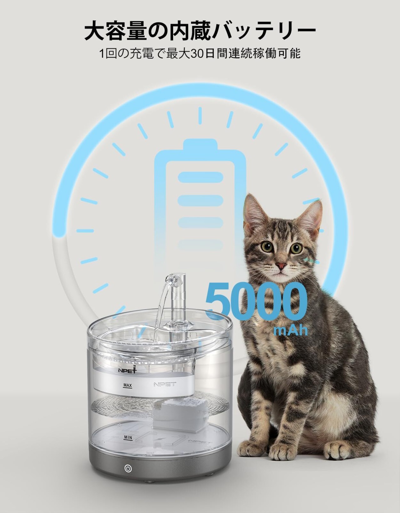 【新着商品】【2025年最新型】NPET 本格コードレス 自動給水器 内蔵5000mAh電池 バッテリ給電 スマート機能搭載 蛇口式給水 1.5L 猫中小型犬用水飲み器