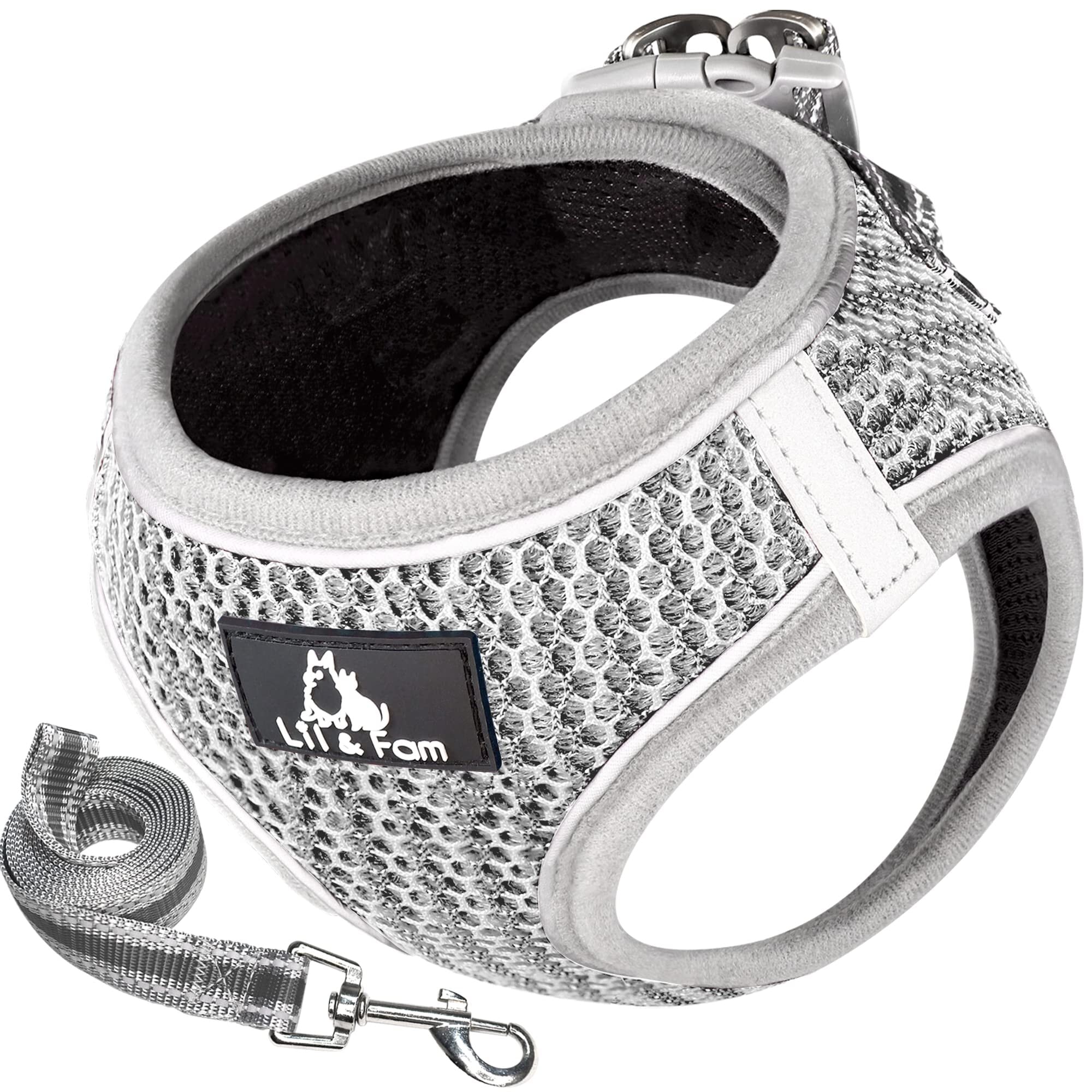 【在庫セール】Lil&Fam 犬 ハーネス 胴輪 リードセット 身体に優しい 反射材付き メッシュ 小型犬 中型犬 猫 (グレー, XSサイズ)
