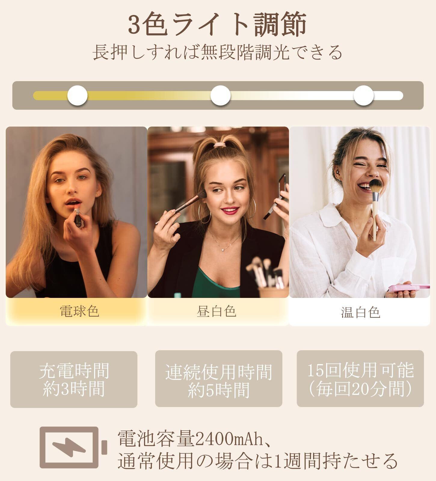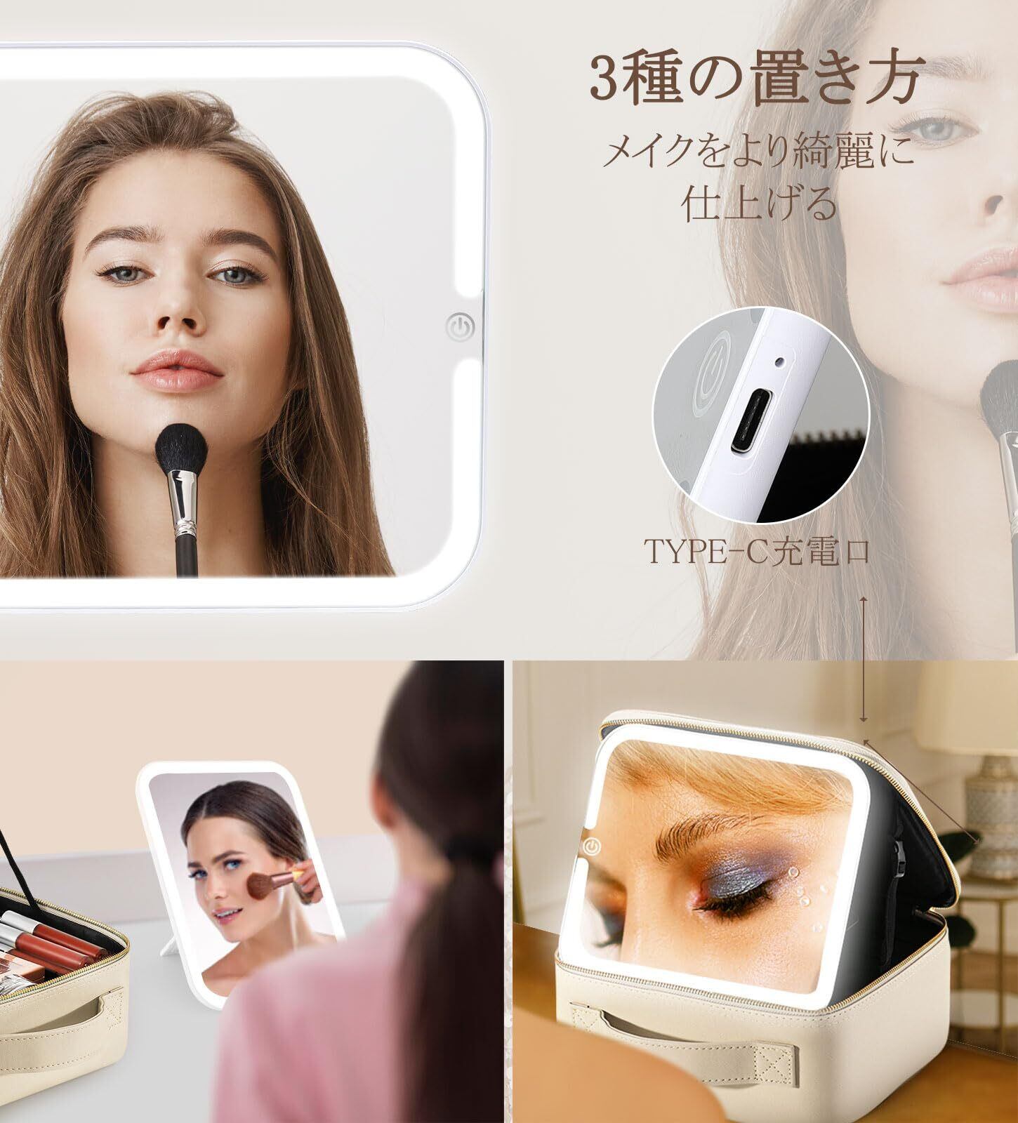 「LEDライト鏡付き」 昼白色・温白色・電球色の3色に切り替えられるLEDライト付き鏡が内蔵され、ボタンを長押しすれば無段階調光できます。USB充電式で在宅、オフィス、車内、外出時などの時にも簡単に充電できます。マジックテープ式固定で、鏡をメイクボックスから外すことは可能です。