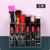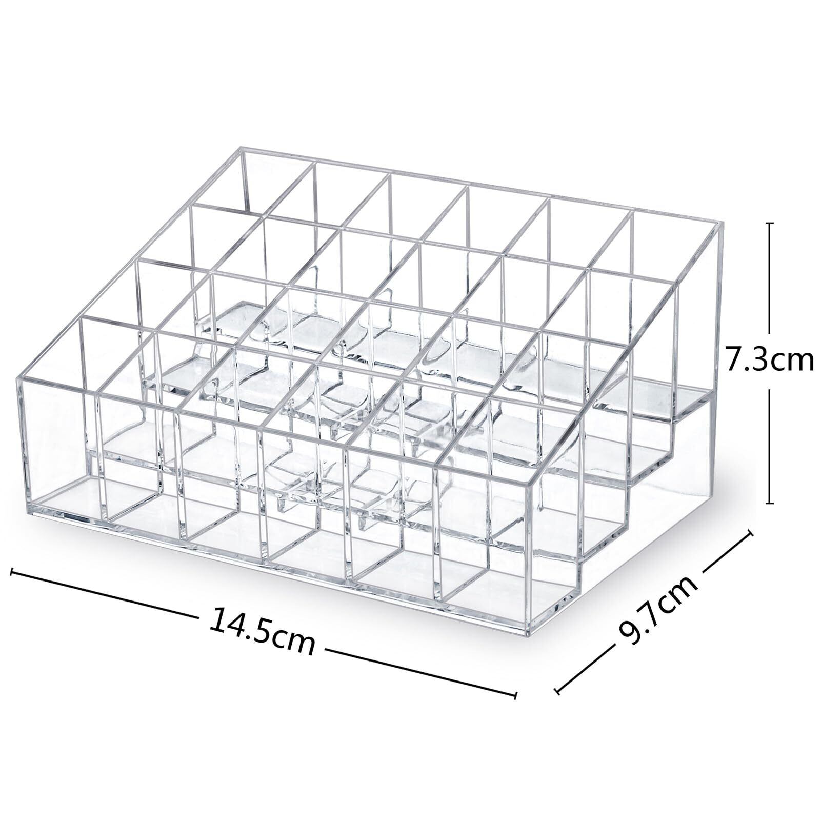 サイズ:14.5cm(縦)×9.7cm(横)×7.3cm(高さ),各スロットサイズ:2.2cm(縦)×2.2cm(横)×4.2cm(高さ)。直径または幅が2.2cm以内の口紅やその他アイテムに適しています。コンパクトで省スペース設計、ビューティーアイテムの整理整頓に最適です。