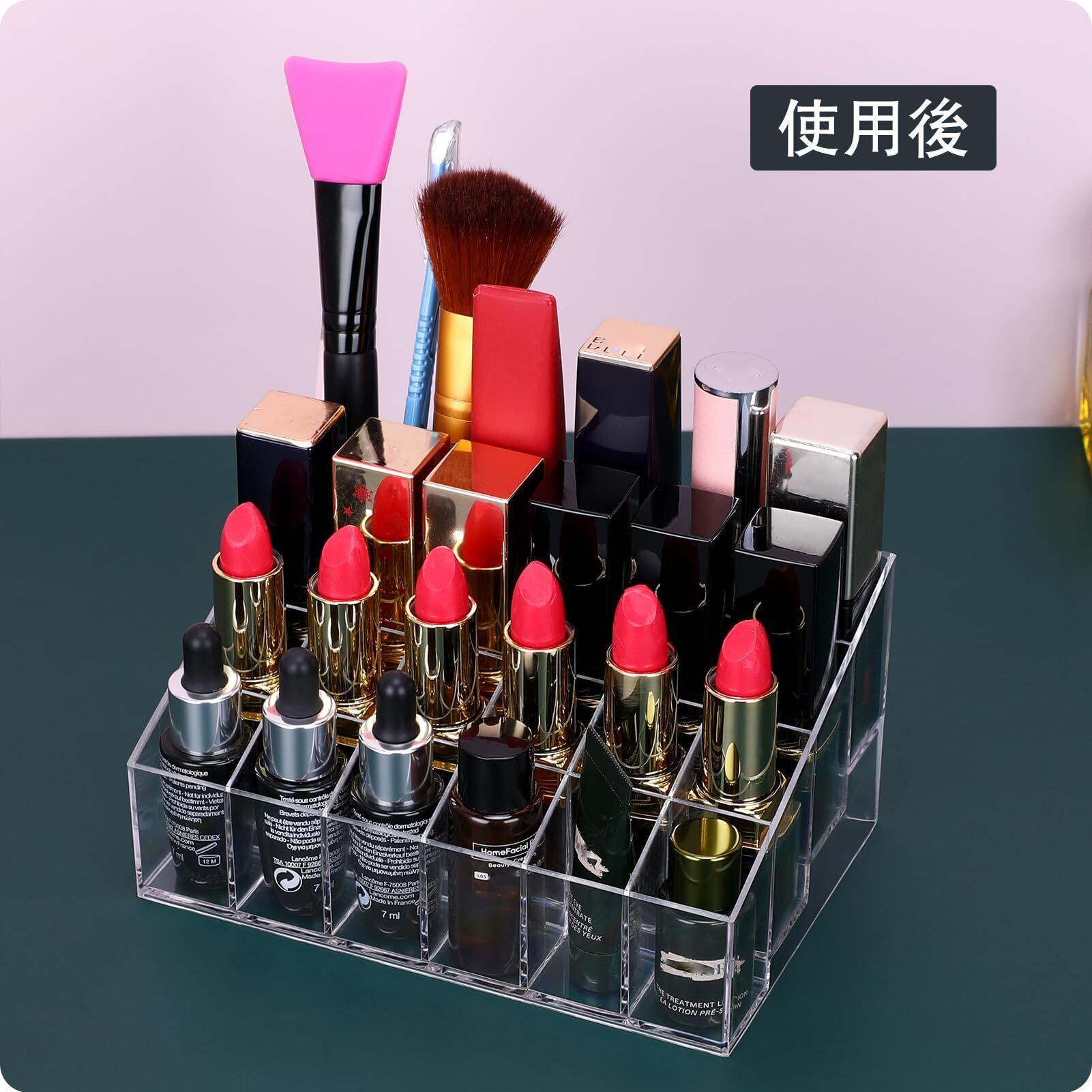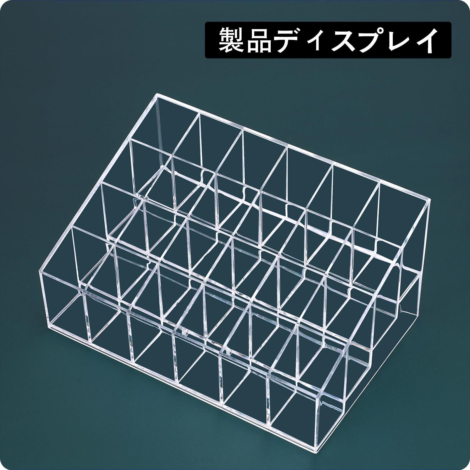 24スロット口紅オーガナイザー:このコンパクトで機能的なオーガナイザーは、最大24個のアイテムを収納可能です。口紅、リキッド口紅、リップグロス、標準サイズのマスカラ、小瓶、ロールオン香水、小型チューブ、ハイライターなどに対応しています。