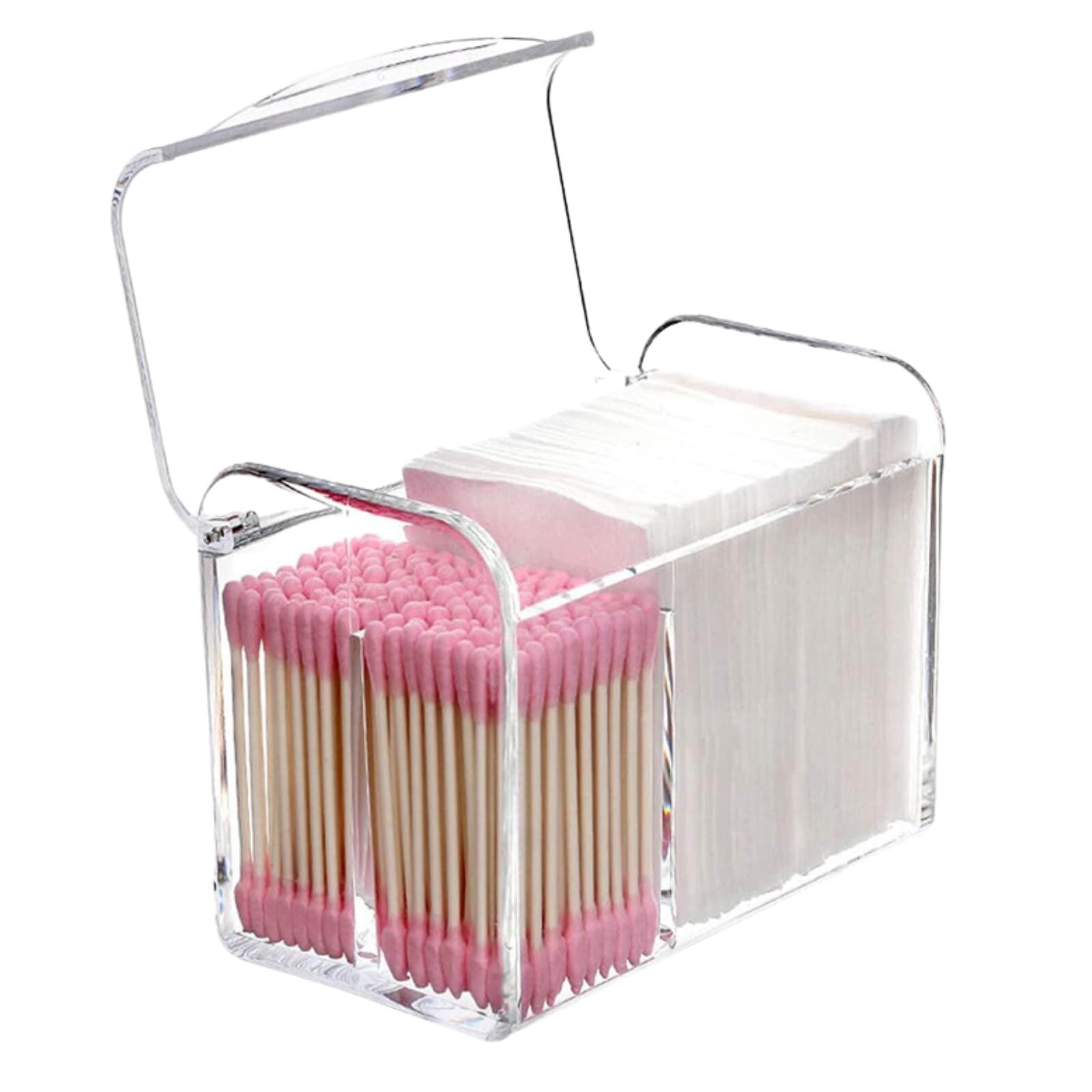 【透明デザイン&ふた付き】アクリル製の透明なデザインで中もしっかりと見え、3つにパーテーションされた区画に綿棒・コットン等がきれいに入ります。ふた付きですので、清潔さを保ちながらお使いいただけます。