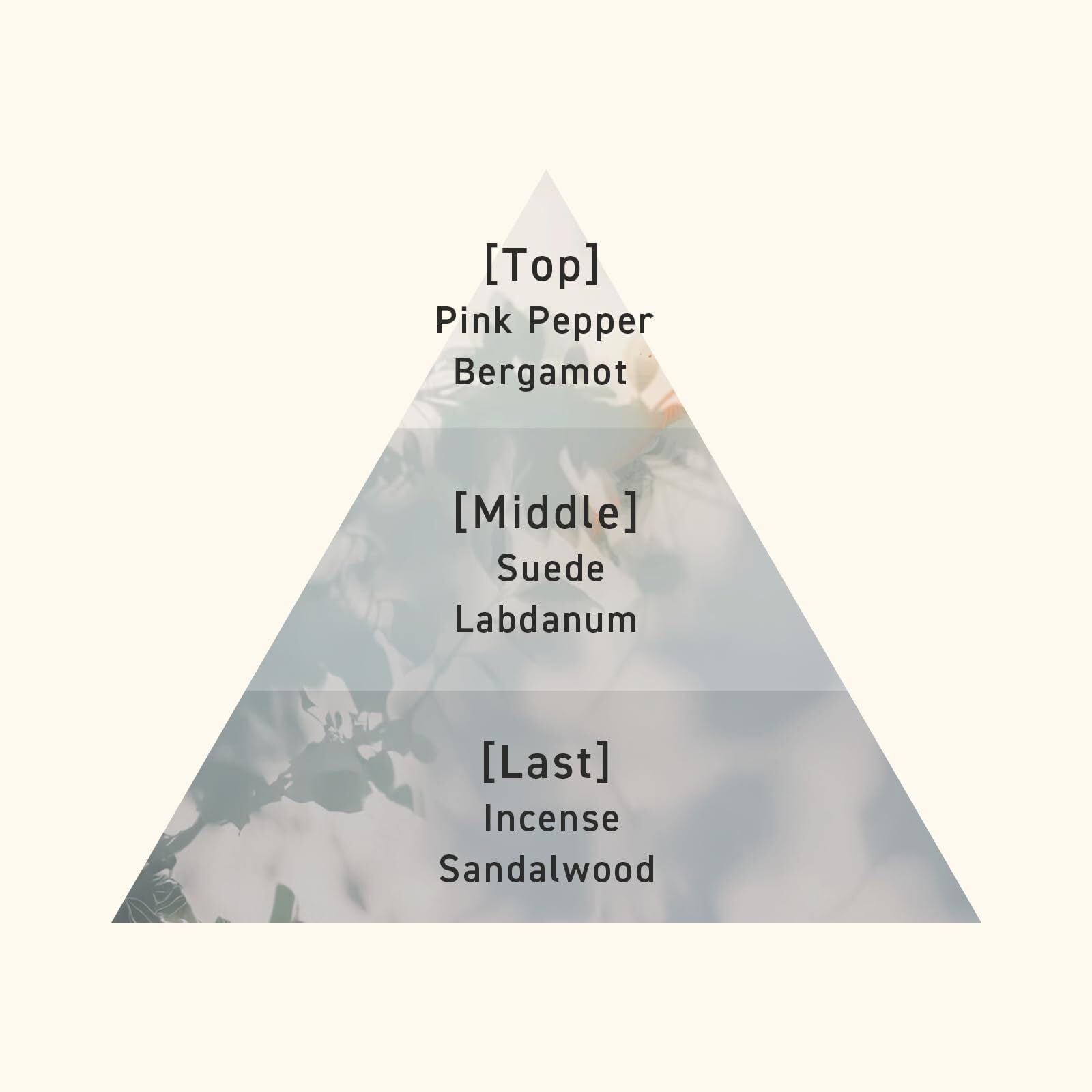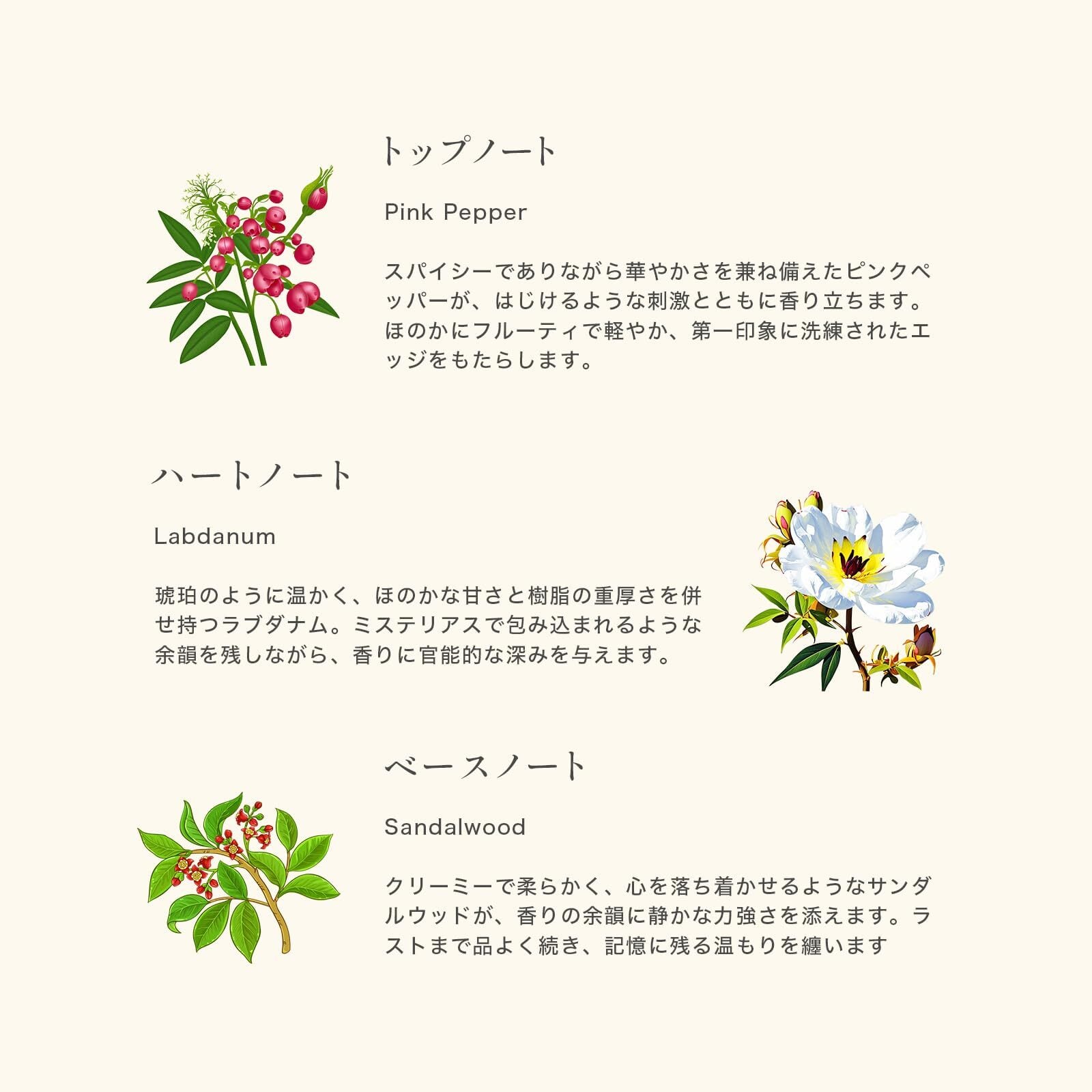 【密やかに揺らぐ高貴な香り】 爽やかな洋ナシ、レモン、ベルガモットをミックスした香りがシルクのベールのような穏やかな温もりが全身を包み、 ほのかに重なるフリージアの香りが深呼吸のたびに甘い陰影を差し込み、夕暮れの静寂を思わせる静かな高揚を呼び覚ます。時とともにローズ、ライラック、ジャスミンのフローラルの高貴な香りが、華やかさを添えます。 最後に残るアンバームスクが深い余韻ー胸の奥で静かに灯る自信と秘めた魅力をそっと解き放つ残香。