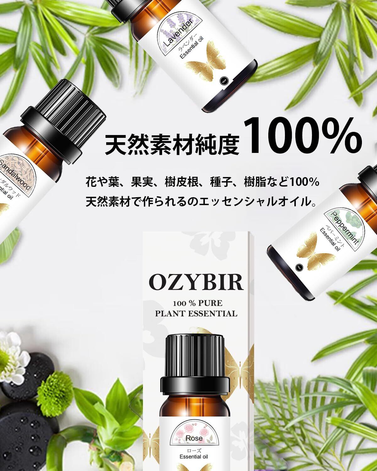 【蝶シリーズ】OZYBIRが取り扱っている精油は100%天然の素材のみを使用しています。蝶は空を自由に飛び回って、花から花へ移動して、自然の味を感じることができて、あなたが蝶のように、自然を楽しんで、自由を感じることができることを望みます。精油は天然の植物から抽出されます。そのため、植物の採取時期、生育環境により色みや香りに若干の差異が生じます。安全で健康的な植物の香り体験でリラックスして呼吸を楽にしましょう。