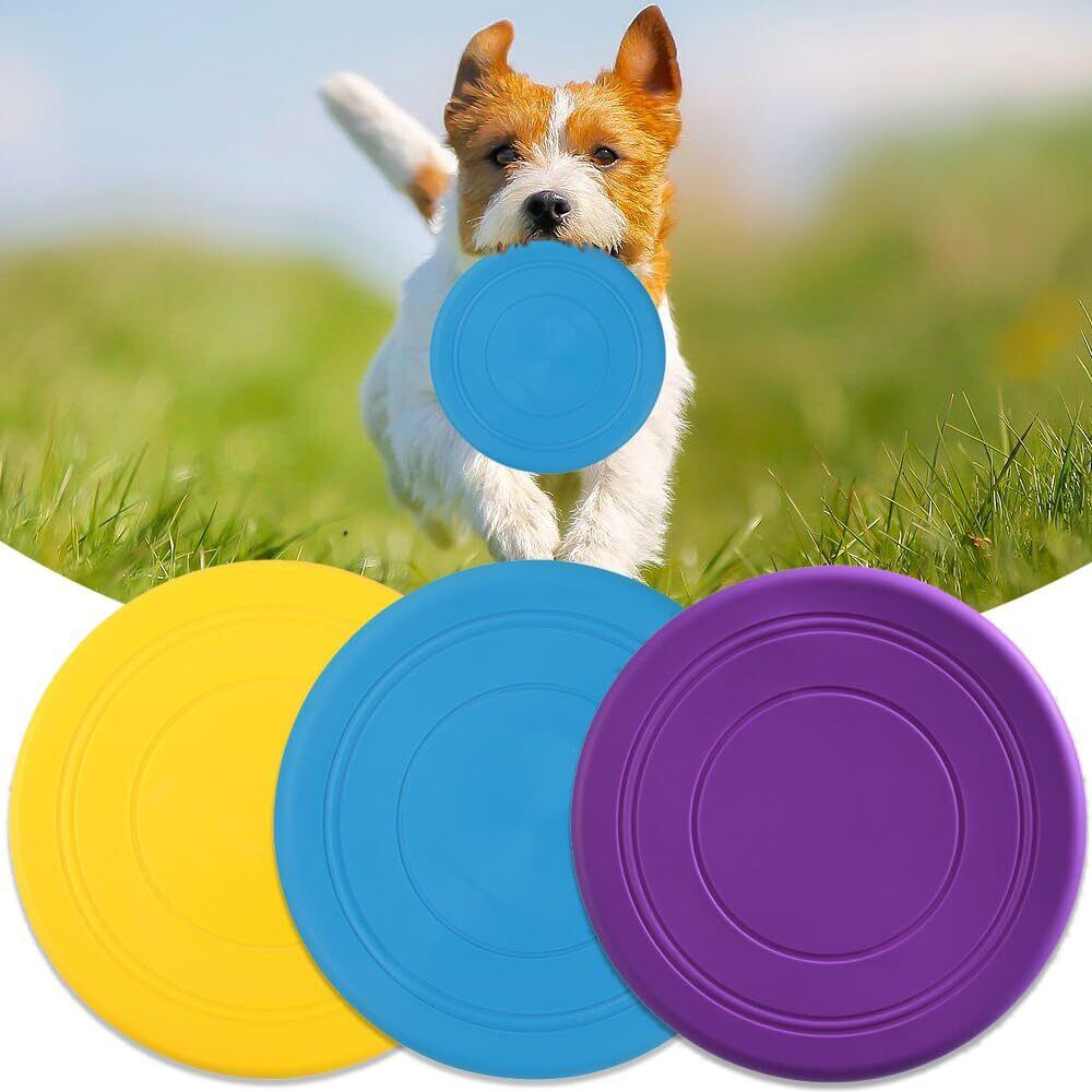 【在庫セール】犬用 フリスビー 投げるおもちゃ 3個セット ペットおもちゃ シリコン製 軽量 柔らかい 犬用スポーツディス 耐噛み性 知能訓練 運動不足解消 フライングディスク 運動 小型犬 中型犬 初心者に適し 約17.5cm 水に浮くおもちゃ(パープル/ブルー/イエロー)