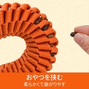 【おやつを挟む】ロープの網目の間にフードを挟むこともできます。ワンちゃんの注意を引き寄せて、遊ぶテンションを上げます。遊びながらおやつを探すことで、心身の鍛錬になり、健康を守ります。