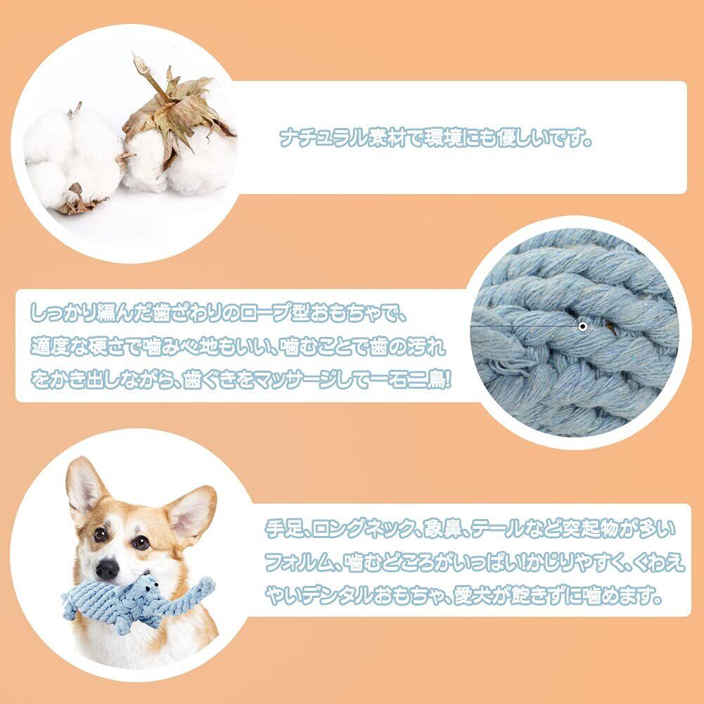 【ナチュラルで安全】ナチュラル素材でできた噛むおもちゃです。100%コットンにこだわり、化学繊維が混ざらないホワイトコットンを染色して作って、ペットの健康にだけでなく、知育成長にも良いオプションです。ナチュラル素材で環境にも優しいおもちゃです。