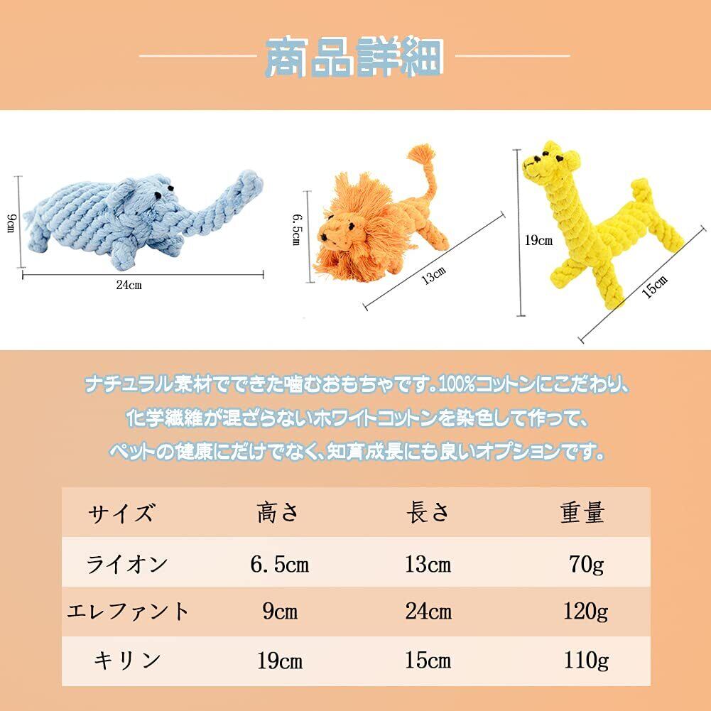 【可愛い動物型】可愛いジャングルの動物をモチーフにしたロープおもちゃ。好きな動物やワンちゃんの口の大きさに合わせて、ライオン・エレファント・キリン3種類の形からお選びいただけます。手足、ロングネック、象鼻、テールなど突起物が多いフォルム、噛むどころがいっぱい!かじりやすく、くわえやいデンタルおもちゃ、愛犬が飽きずに噛めます。癒し顔の動物たちで、SNS撮影やお友達へのプレゼントにもオススメです。