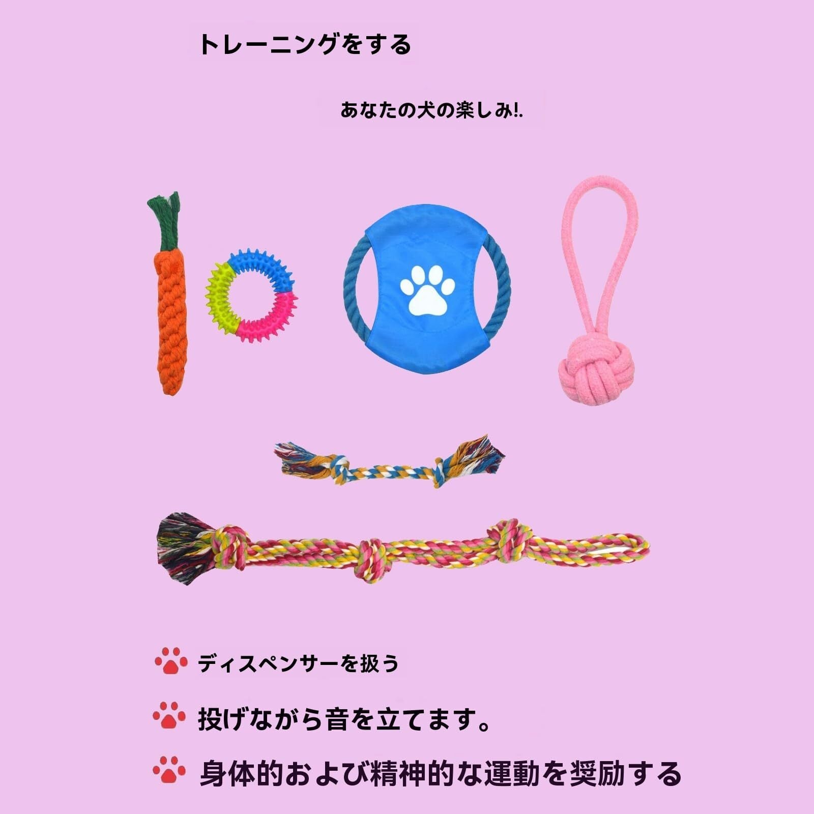 安全で健康的な犬用噛みおもちゃ: このおもちゃセットは、子犬の歯をきれいにしたり運動させたり、噛むときに歯石を抑制したり、細菌の増殖を抑えたり、歯周病を防いだりするのに役立ちます。犬用リーシュおもちゃは、100%天然の洗える綿と噛めるゴムで作られており、無毒で無味で噛めるので、ペットが安全に噛んで遊ぶことができます。