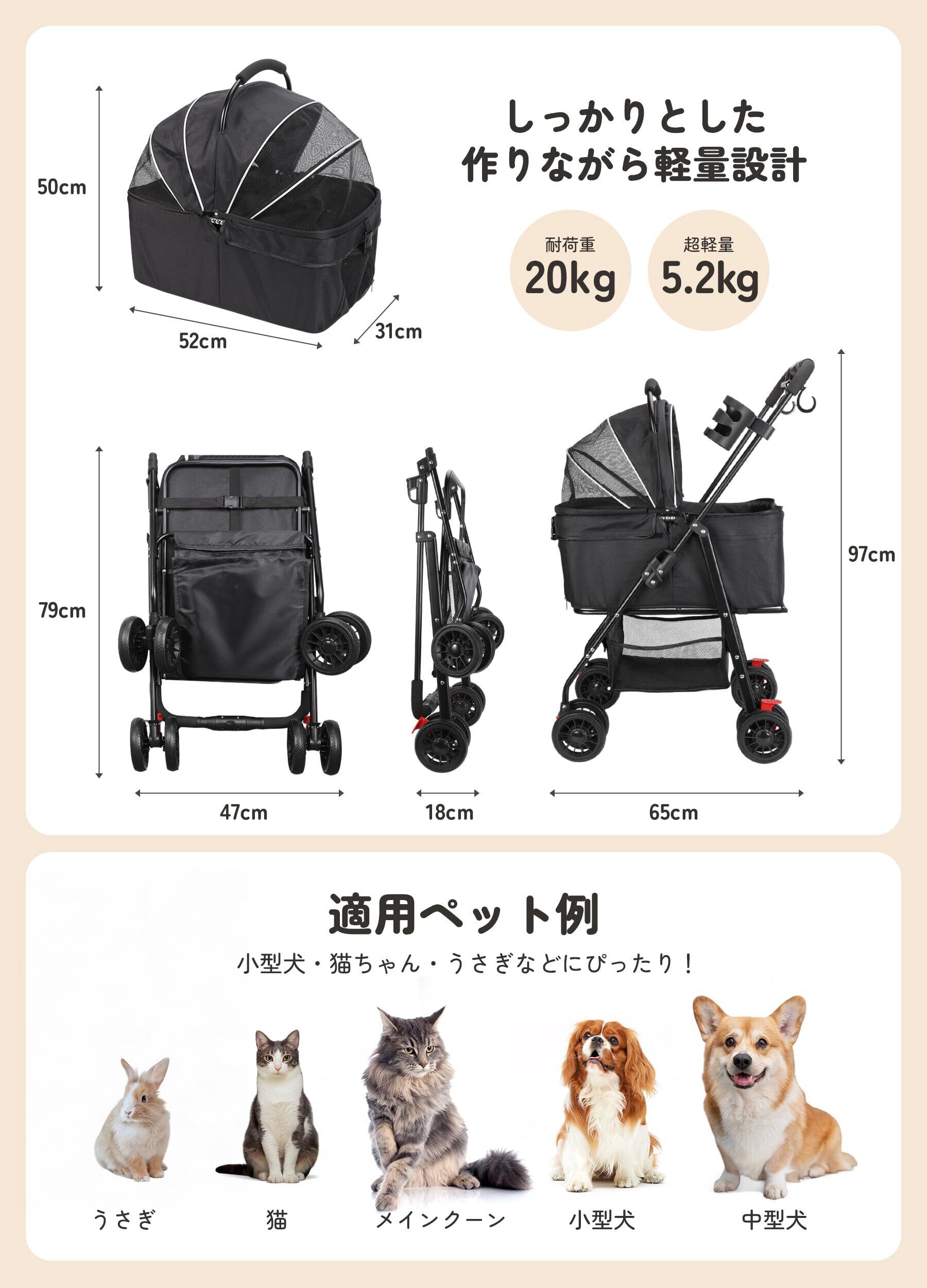 【耐荷重20kg&軽量ボディ(5.2kg)】最大20kgまでの耐荷重を実現したしっかりとしたフレーム構造で、子猫や小型犬の多頭や中型犬1匹の乗車にも対応。ペットキャリーカート重量はわずか5.2kgなので、女性でも片手で楽々持ち運べます。