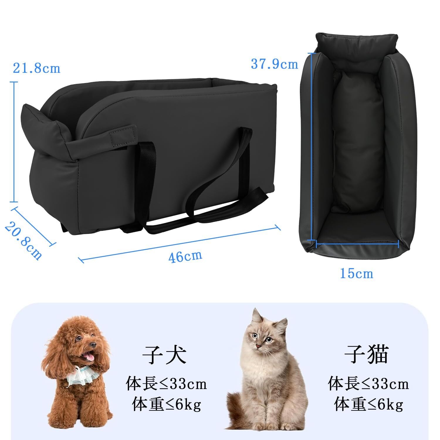 【製品仕様】シートサイズは46cm×20.8cm×21.8cm(内部37.9cm×15cm×21.8cm)です。シートは6kg(最大長≤38cm、最大幅≤15cm)未満の小型犬や猫に適しています。購入前に犬と猫を測定してください。