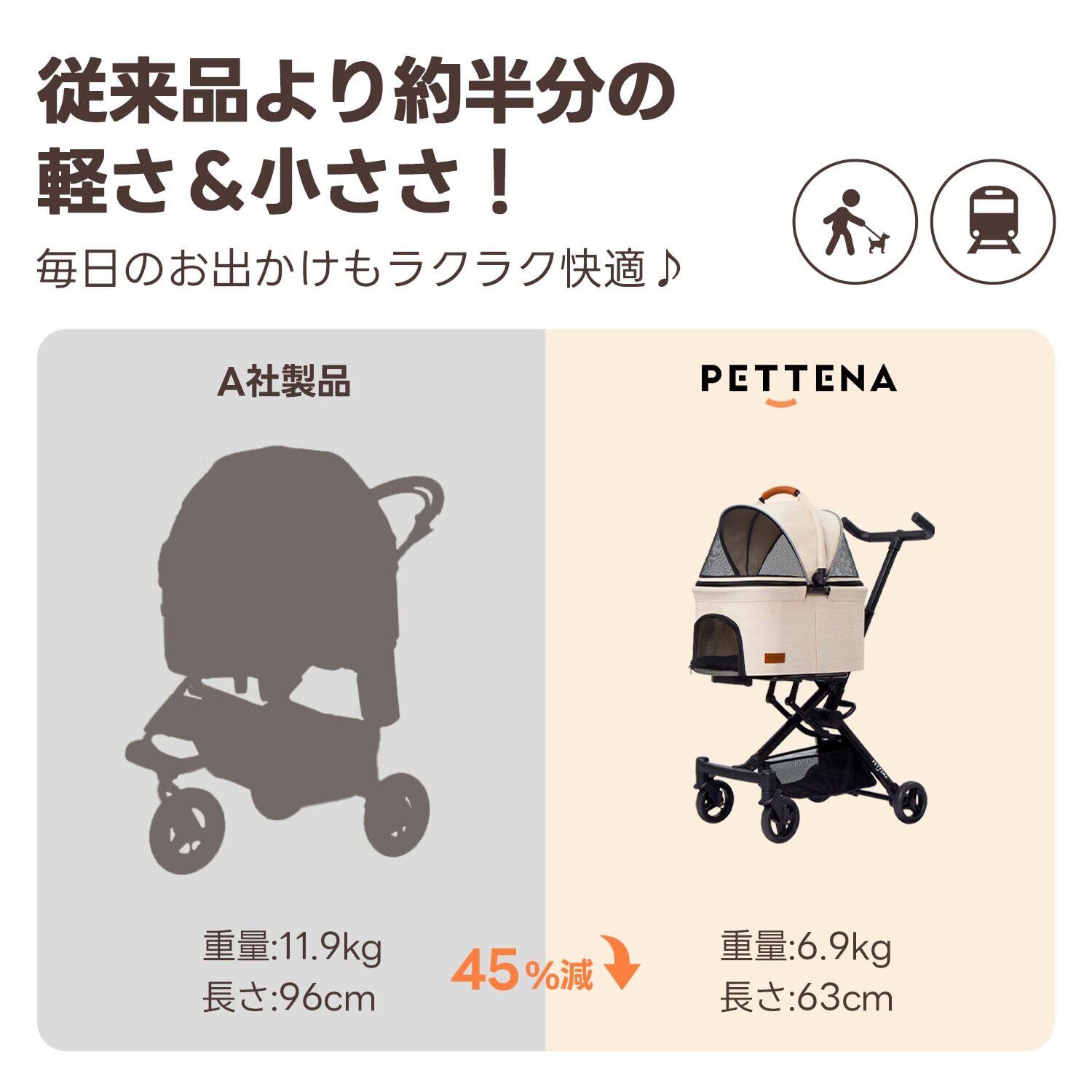 ご注意:販売中の「PETITE」には電車用カバーは付属しておりません。購入前にご確認ください。【小型犬専用&超軽量設計】PETTENAペットカートPETITEは、小型犬のために特別に設計されています。全体の重さはわずか6.9kgで、従来のペットカートより30%も軽量化されています。折りたたんだ時のサイズは、従来品より体積が50%減少し、わずか18×46×53cm(雑誌一冊分程度)のコンパクトサイズに。これにより、玄関や車のトランクにも楽に収納でき、非常に便利です。最大耐荷重は20kgで、軽量ながらもしっかりとした強度を誇ります。カートの重量はわずか6.9kgで、同じ耐荷重の従来品と比べて約20%軽く仕上げられています。キャリーコットは2.4kg、フレームは4.5kgで、どちらも女性でも片手で楽に持てる軽さです。また、フレームには高品質なアルミニウム合金を採用しており、耐久性と軽さを両立。ペットとのお散歩や長距離旅行に最適で、ペットも快適に過ごせます。階段や段差でも簡単に持ち上げることができるので、どこへでも気軽にお出かけできます