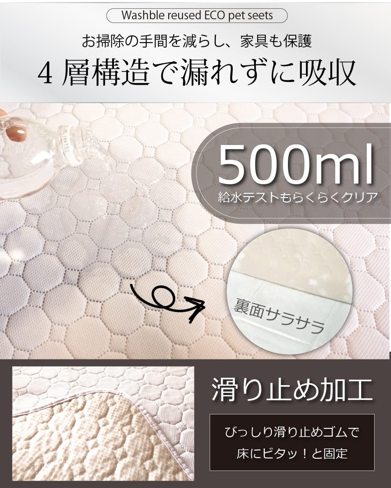 【毎日の大量シーツゴミをゼロに】 洗えるペットシーツ は一般的な使い捨てペットシーツとは異なり、洗って何度でも繰り返し使えるので、地球にもとてもやさしいエコシーツです。毎日数枚〜数十枚使っていたペットシーツ、洗えるので1日1回のお洗濯で済みます。ゴミ出しストレスから解放されます。一般的なシーツ同様に防水シートなので、床が濡れてしまう心配はありません。ペットシーツの裏面には滑り止めゴムがついているので、防水マットは床にビタッとくっつきズレることはありません。