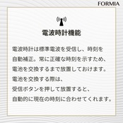 機能:電波受信機能(自動受信、手動受信)、温度表示、湿度表示、オートカレンダー、夜間秒針停止機能 (午後10:00~午前6:00)、ステップ秒針