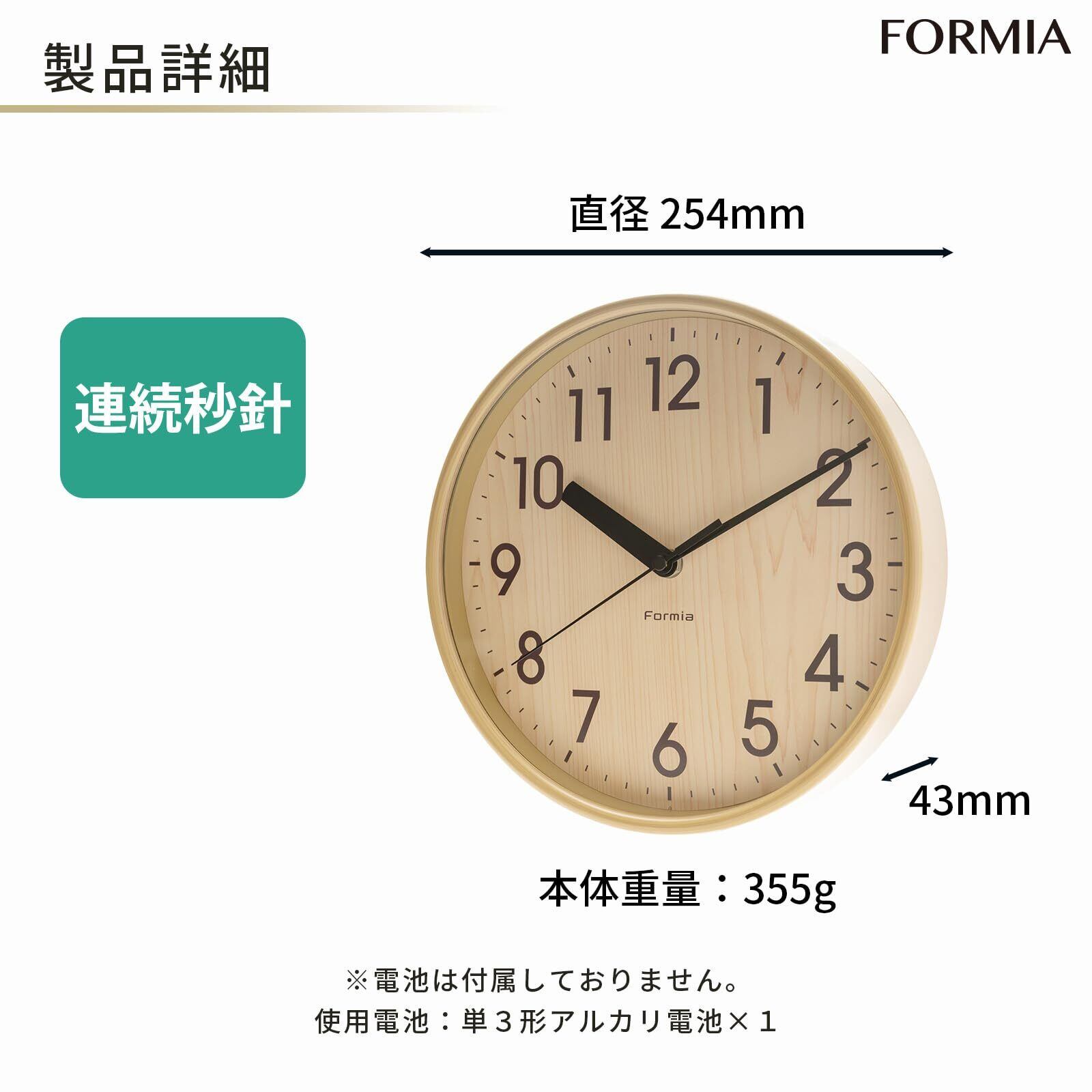 Fornia(フォルミア) 掛け時計 天然木調 ナチュラル 直径25.4cm シンプルデザイン 北欧デザイン 連続秒針 静音 ウォールクロック HIC-006W-N