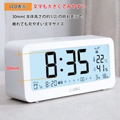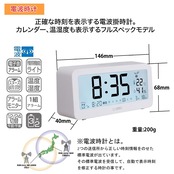 【多機能デジタル時計】①12/24H時間表示 ②曜日 ③カレンダー ④目覚まし時計 ⑤温度・湿度計 ⑥スヌーズ機能 。高精細LCD、 温度、湿度、時刻、日付、曜日、アラーム同画面に表示