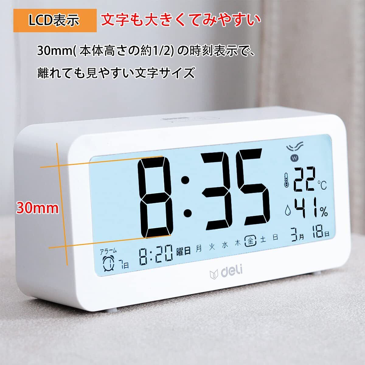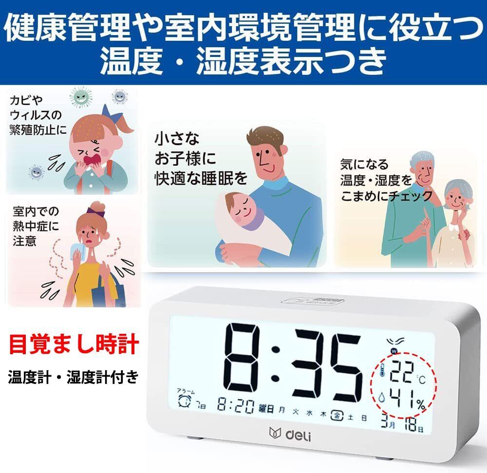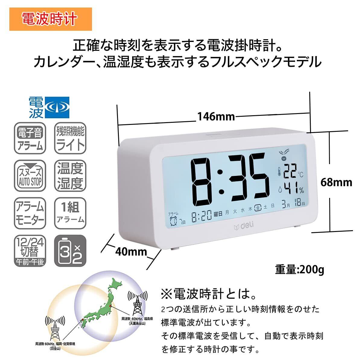 Deli 目覚まし時計 電波時計 メーカー2年 文字も大きくてみやすい 乾電池式 画面が明る 温度計・湿度計付き 多機能デジタル時計 静音 スヌーズ機能 コンパクトでシンプル ファッショナブルな外観 簡単な操作で 置き時計(14.6cm,白)