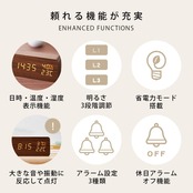 モード機能/時刻:〇/温度:〇/湿度:〇/日付:〇/アラーム:〇(3種類+土日オフ):明るさ調節:3段階/省電力:〇