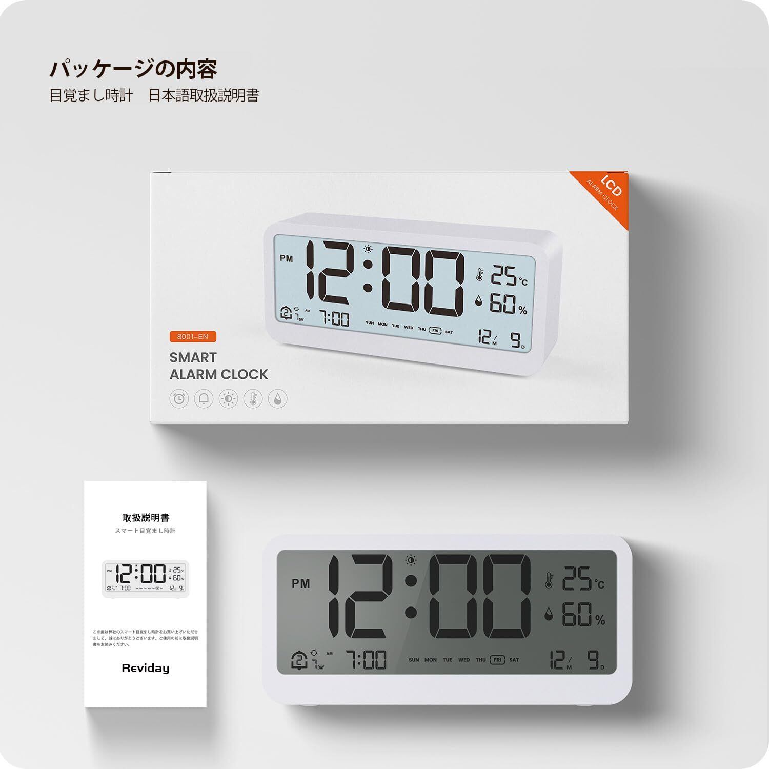 【数量限定】目覚まし時計 デジタル時計、Reviday 置き時計 2組アラーム 明るさ調整 見やすい 温度計・湿度計付き 卓上時計 多機能デジタル時計 静音 スヌーズ機能 夜間モード 白 日本語説明書付き ホワイト(乾電池付属無し)
