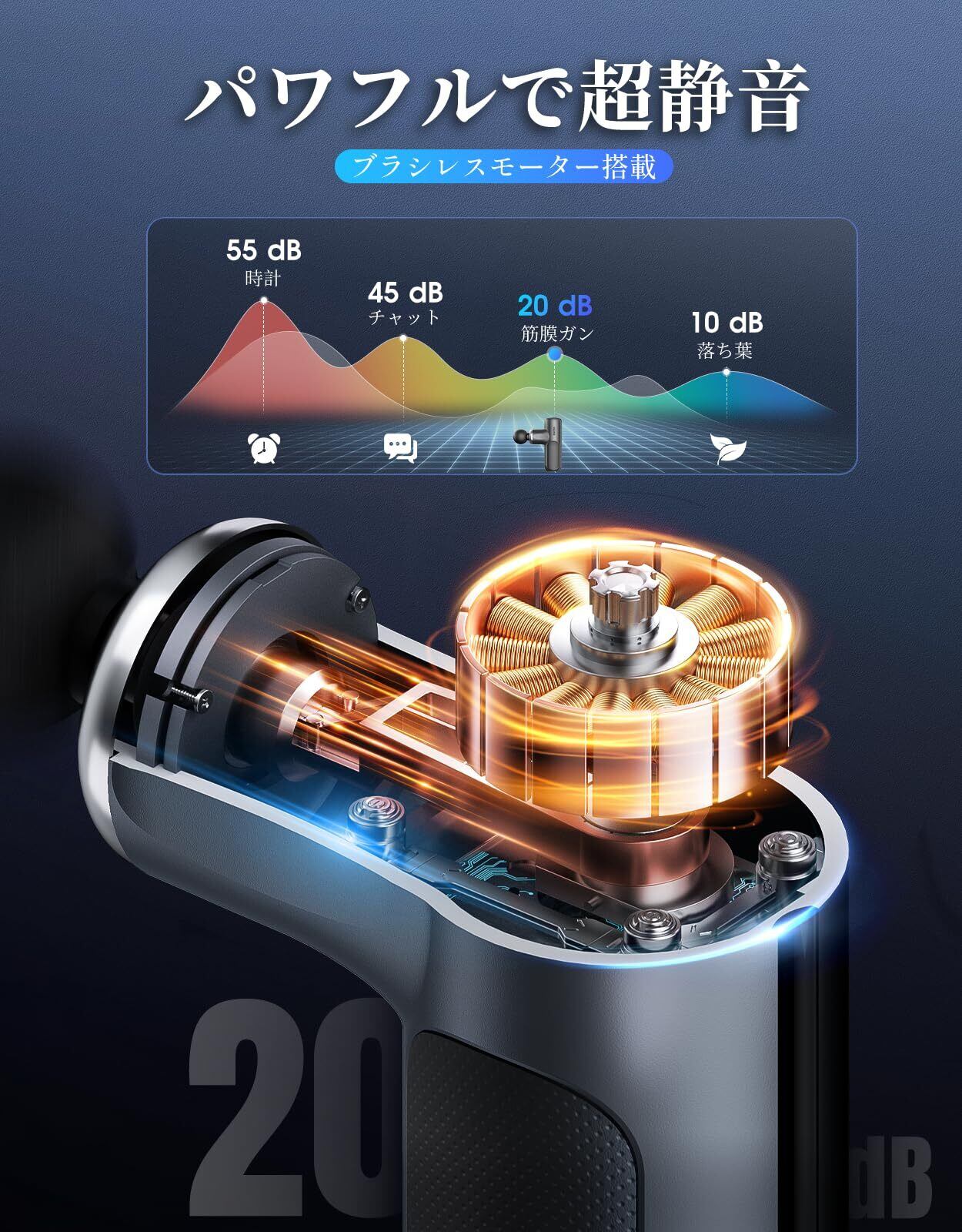 【パワフル&低騒音】Kycle筋膜リリースガンはノイズを低く抑えるため、先端ブラシレスモーターを採用し、 最大3200rpm/minでの作動音も45dB(日常会話の程度)以下に抑えられて非常に低騒音で、時間や場所に気にする必要はなく、周りの迷惑になる心配もなし、ジムやオフィス、いつでもどこでも楽しむことができます。