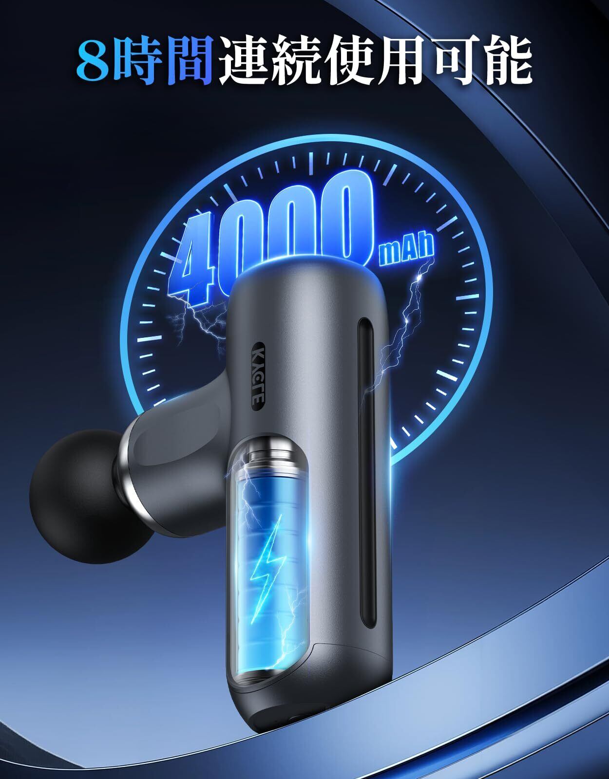 【Type-C急速充電&持ち運び便利】僅か2時間でフル充電!4000mAhバッテリーが内蔵され、最大8時間連続使用可能(電池の残量や充電環境、使用環境によって大きく前後します)。 Kycle筋膜リリースガンは一回のフル充電で、極上のボディーケアが何回も楽める。パワフルでありながら394gの小型設計で収納袋付きで持ち運びにも便利です。宅でのご使用はもちろん、職場/ジム/公園などにも簡単に持ち運び可能です。