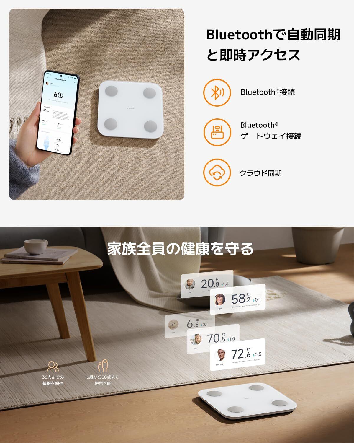 Bluetooth接続に対応:Bluetoothゲートウェイを介してスマートフォンとペアリングして接続できます。測定データは自動的に保存されて、サーバーにアップロードされるため、アプリ上でいつでも簡単に表示できます。