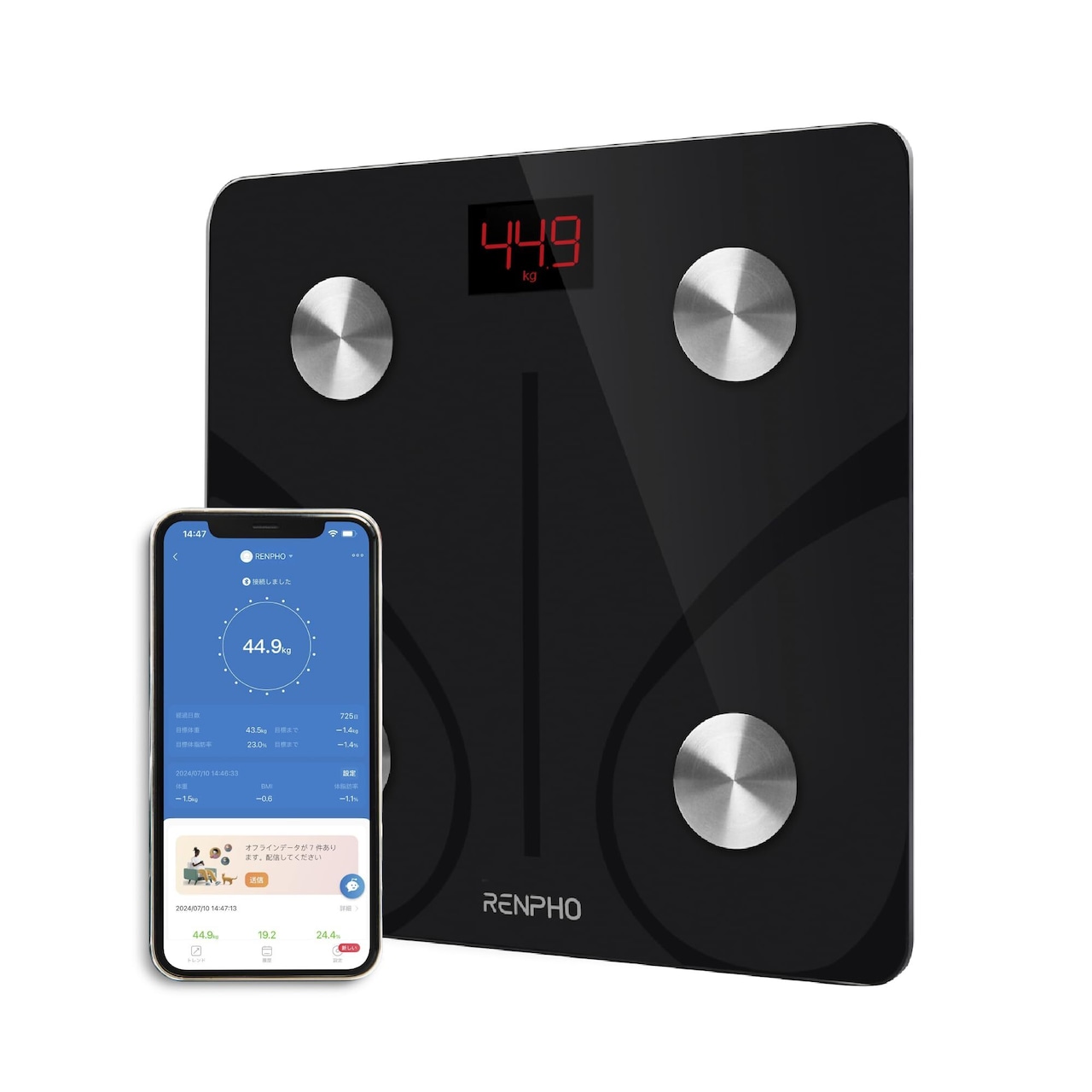 【アプリで日々の成果を可視化】専用アプリ「Renpho Health」とBluetooth連携すれば、体重などの健康状態をスマホに記録できます。さらにグラフを自動生成し、標準値や過去データと比較できるので、改善のヒントに繋がります。Apple HealthcareやGoogle Fitなど、他社アプリとも連携できます。