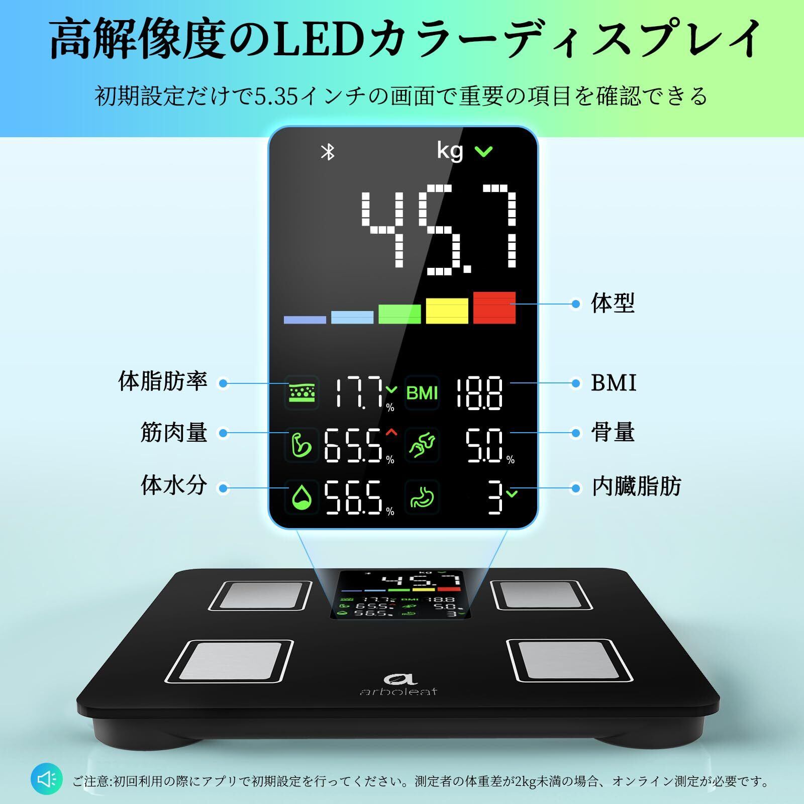 【在庫セール】arboleaf 体重計 スマホ連動 体脂肪計 体組成計 ヘルスメーター 高精度 あすけん連携 乗るだけ 180kgまで 14項目測定 体脂肪率/基礎代謝量/水分量/体内年齢/筋肉量/BMIなど【Fitbit/apple watch/GoogleFit/あすけん/appleヘルスケア連携】Bluetooth対応 家族一気に測定 日本国内サポート