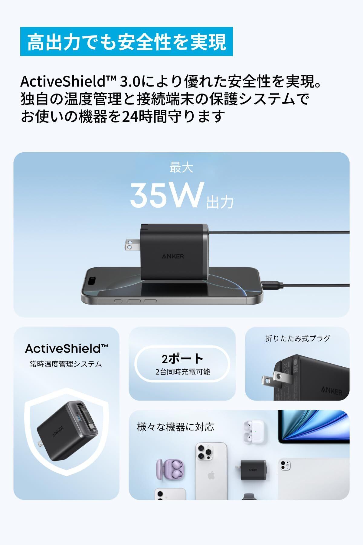 Anker Nano Charger (35W, Built-In 巻取り式 USB-Cケーブル) ブラック USB PD USB-C 急速充電器【PSE技術基準適合】iPhone 16シリーズ MacBook Air Galaxy Android スマートフォン ノートPC その他各種機器対応