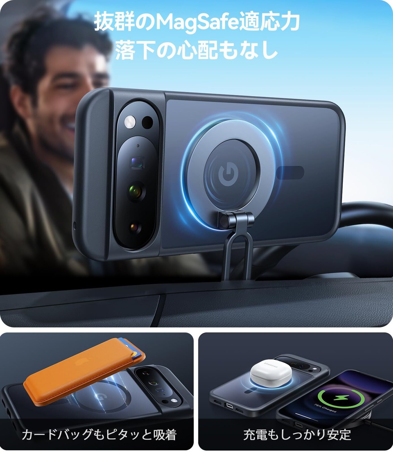 【えっ、こんなに速いの!? ワイヤレスで数分フル充電に!】面倒なケーブルとはさようなら、ワイヤレス充電がもっと楽に!このケースはN52 マグネットが搭載され、Magsafe 対応の各種アクセサリーと互換性がある。強力な磁力により、車載ホルダーやワイヤレス充電器にスムーズに吸着する。外出先でスマホの電池が切れそうになった時でも、Magsafe 対応のワイヤレス充電パッドに簡単に吸着して充電を開始できる。また、マグネットの耐久性にもこだわり、長期間の使用でも磁力が低下することはない。精密な設計により、磁石の配置が最適化されており、安定した吸着性能をする。磁界強度測定値18mT(ミリテスラ)は業界最高水準で、充電効率97%を維持。対応機種:google pixel 10 pro ケース