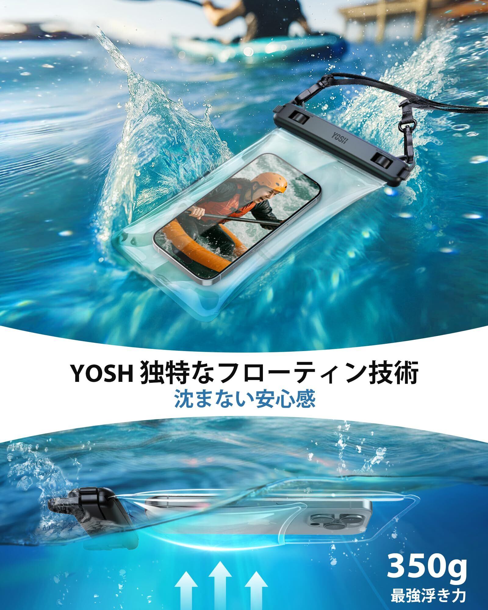 業界最強350gの浮き力:YOSH防水ケースは従来品比40%増の350g浮力を実現。新型iPhone 16 Pro Maxの大型化(画面サイズ+5%)と重量増(+19g)に対応した業界最高水準の浮力設計です。万が一水没時でも、スマホが確実に水面に浮上することをします