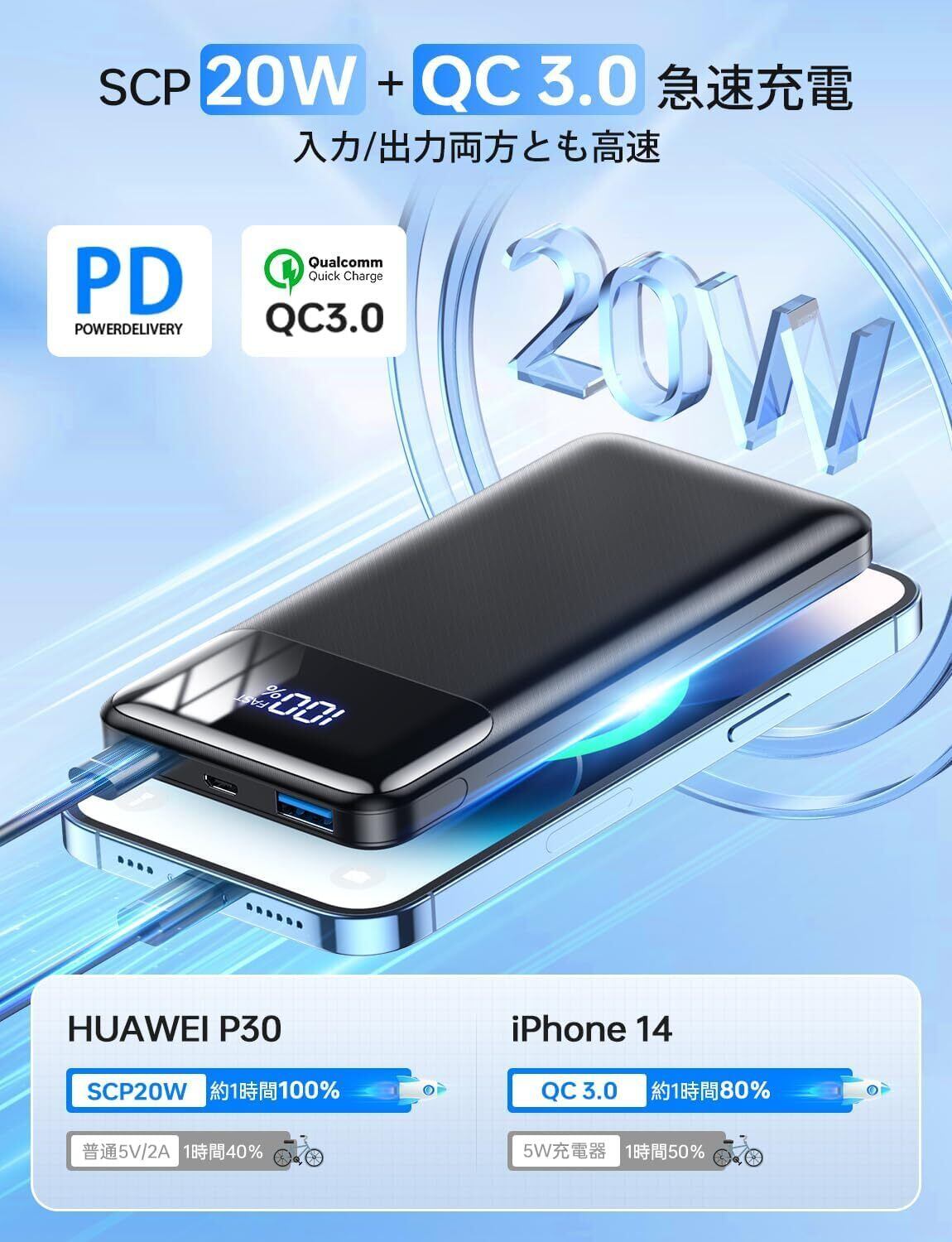 モバイルバッテリー 【20000mAh大容量・薄さ16mm・PD20W急速充電】モバイルバッテリー 超軽量 小型 QC3.0対応 LED残量表示 最大3台同時充電可能 スマホ充電器 携帯充電器 iPad/iPhone/Android各種スマホ対応 PSE認証済み&安全回路保護 機内持ち込み可能 旅行/出張/アウトドア/キャンプ/停電対策/防災 日本語取扱説明書