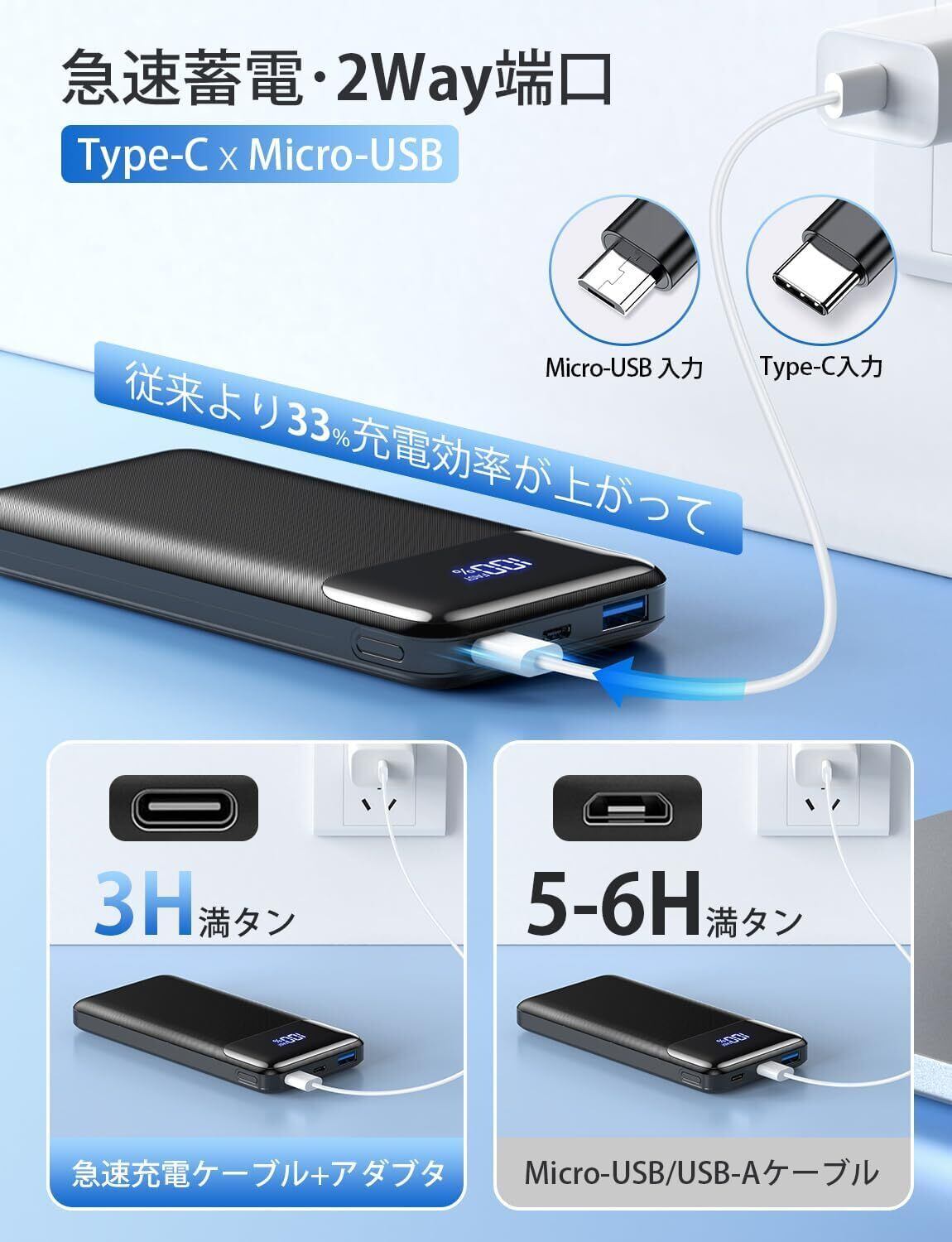 【先端の急速充電技術&USB-C入出力ポート】本モバイルバッテリーは急速充電技術がさらに進化、高精度・高安定度の出力電圧、出力電流を実現するPWM(Pulse Width Modulation)制御の活用により高効率充電を達成しました。モバイルバッテリー本体を約3時間で充電でき、チャージ時間を大幅に短縮することができます。またPower Delivery (5V = 3A )、QuickCharge3.0等の充電規格に準拠し、最大20W出力で充電が可能、一般的なAC充電器と比較、最大4.0倍速く充電できます。従来のUSB Aポート出力に加え、入力・出力に対応したUSB Type-Cポートを搭載しており、お使いの充電ケーブルに合わせて接続するポートをお選びいただけます。旅行、出張など電源の取りにくい環境でバッテリー切れの心配がありません。※ご注意:お使いのUSB充電器により、本体の満充電時間が変わります。(PD充電器は約3時間;普通のACアダプターは約5~6時間)