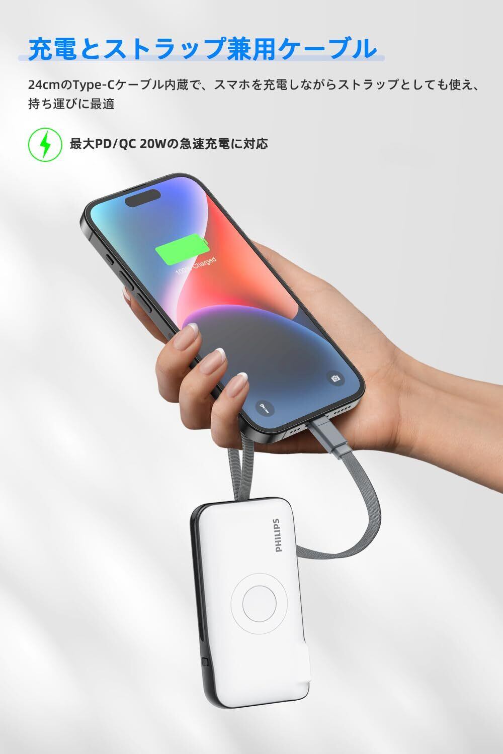 Philips(フィリップス) モバイルバッテリー コンセント一体型 10000mAh Apple Watch対応 アップルウォッチ ACプラグ付き 大容量 携帯充電器 PD 20W出力 4台同時充電 折りたたみ式/USB-Cケーブル内蔵/パススルー機能/ディスプレイ搭載/プラグ変換可能 PSE認証済 ホワイト DLP4350Q